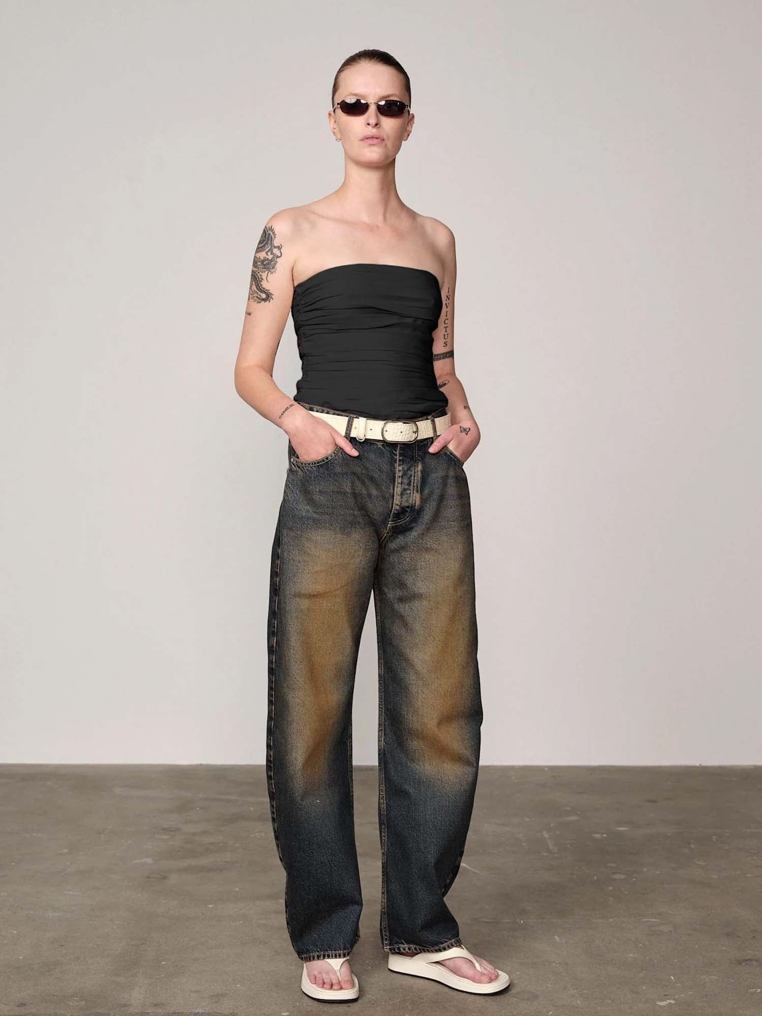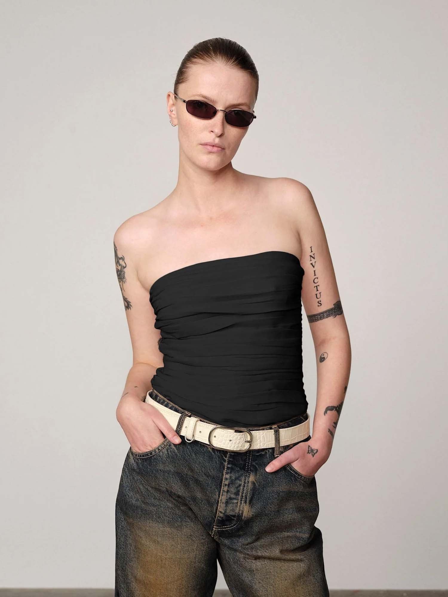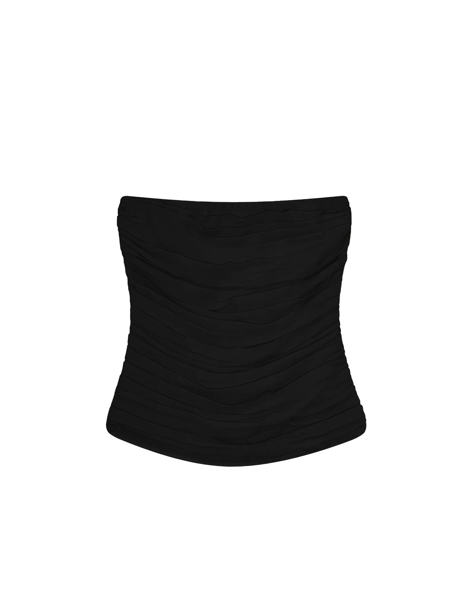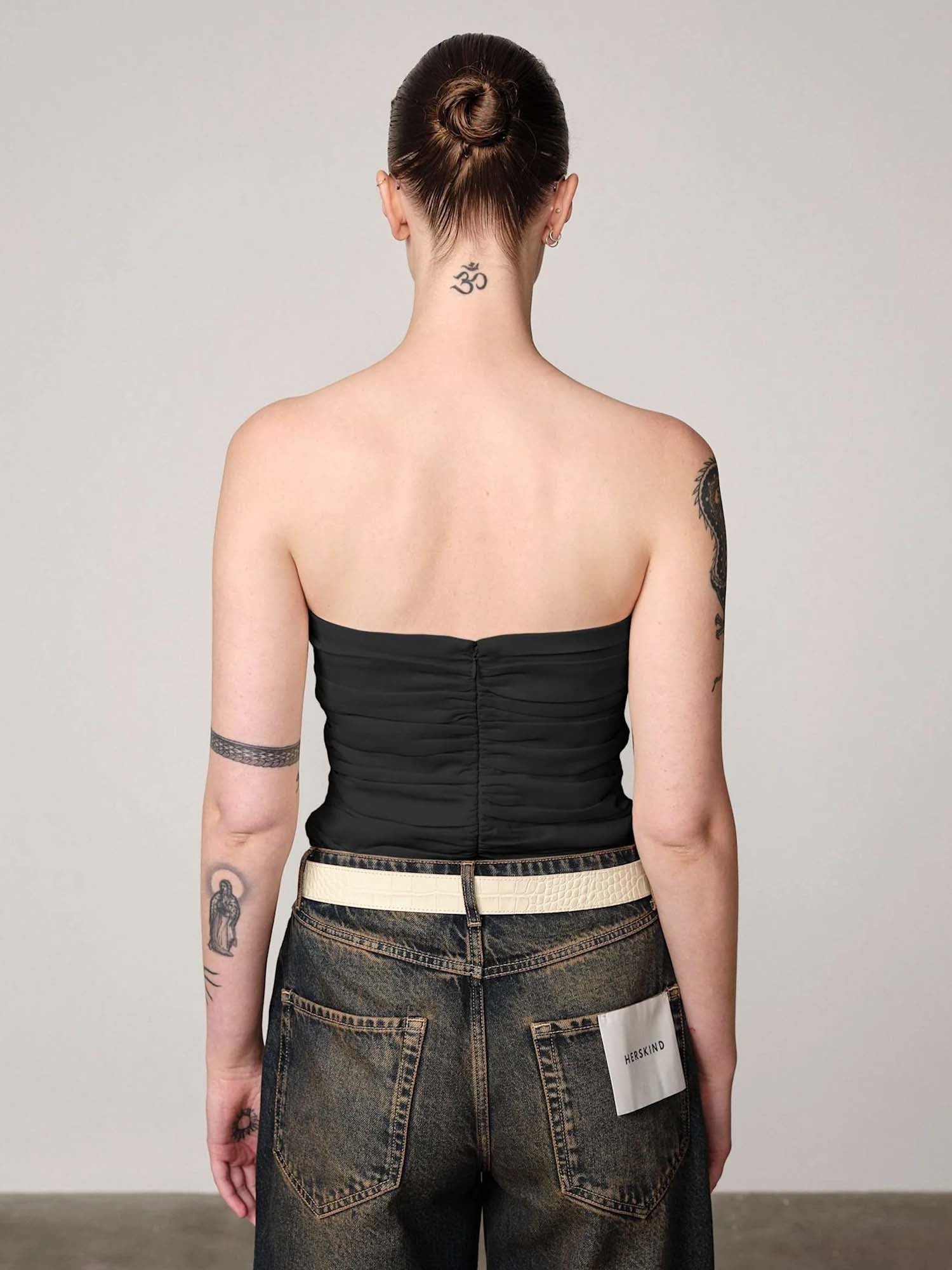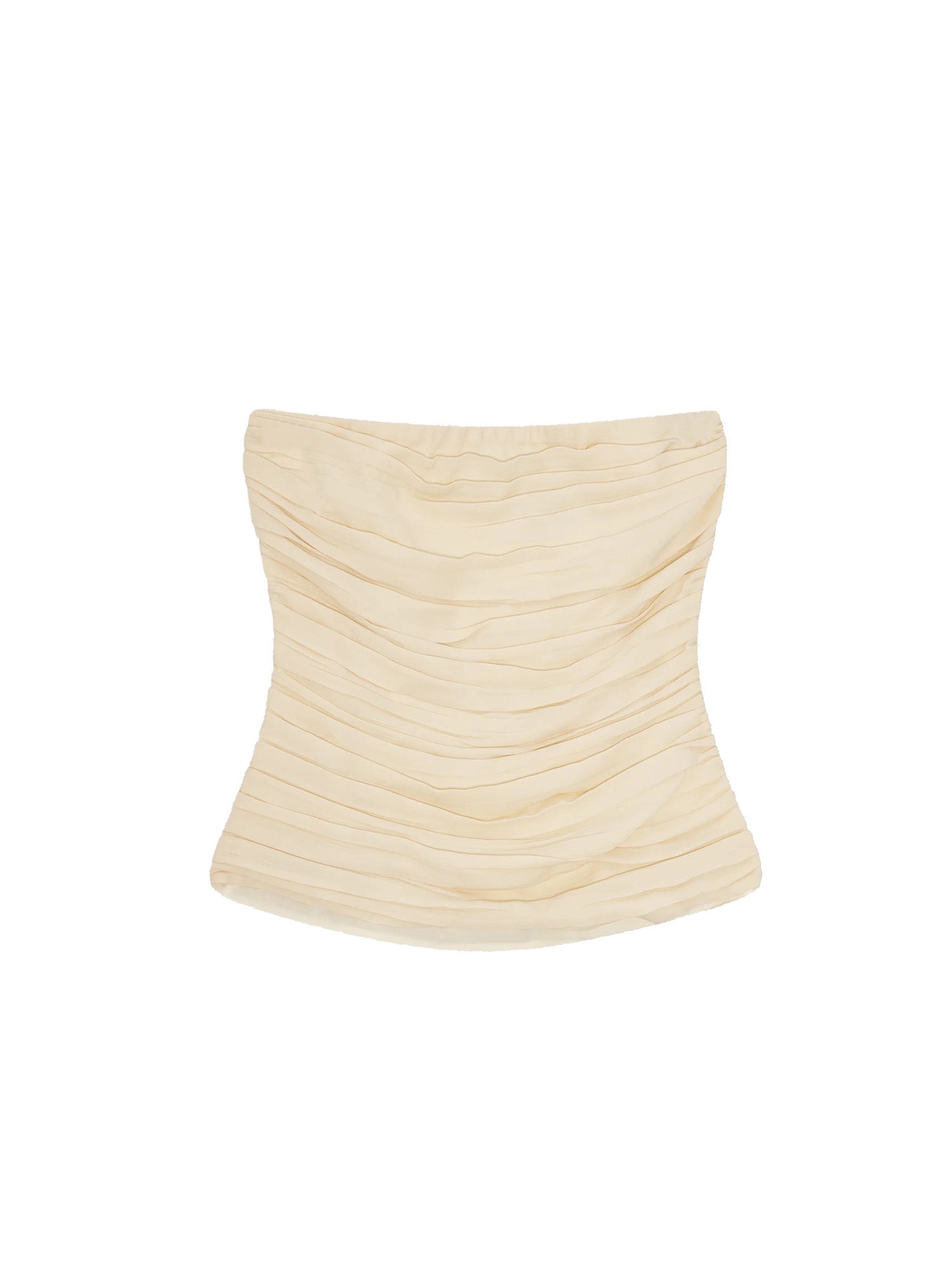 An elevated evening top in glossy acetate blend. The fluid drape and minimal silhouette make it a versatile statement piece, finished with an invisible zipper at the center back for a refined closure.