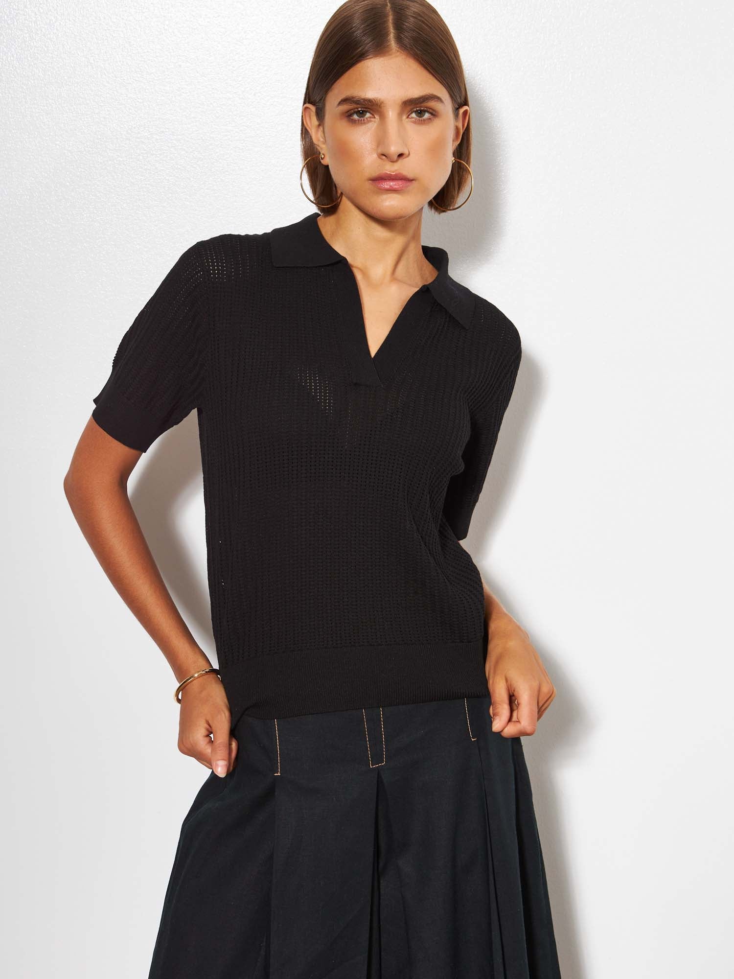 Elevate your style with the Emery a short sleeve collared sweater that exudes sophistication. It's crafted from a lightweight fabric that provides comfort and versatility, perfect for both casual and formal styling.