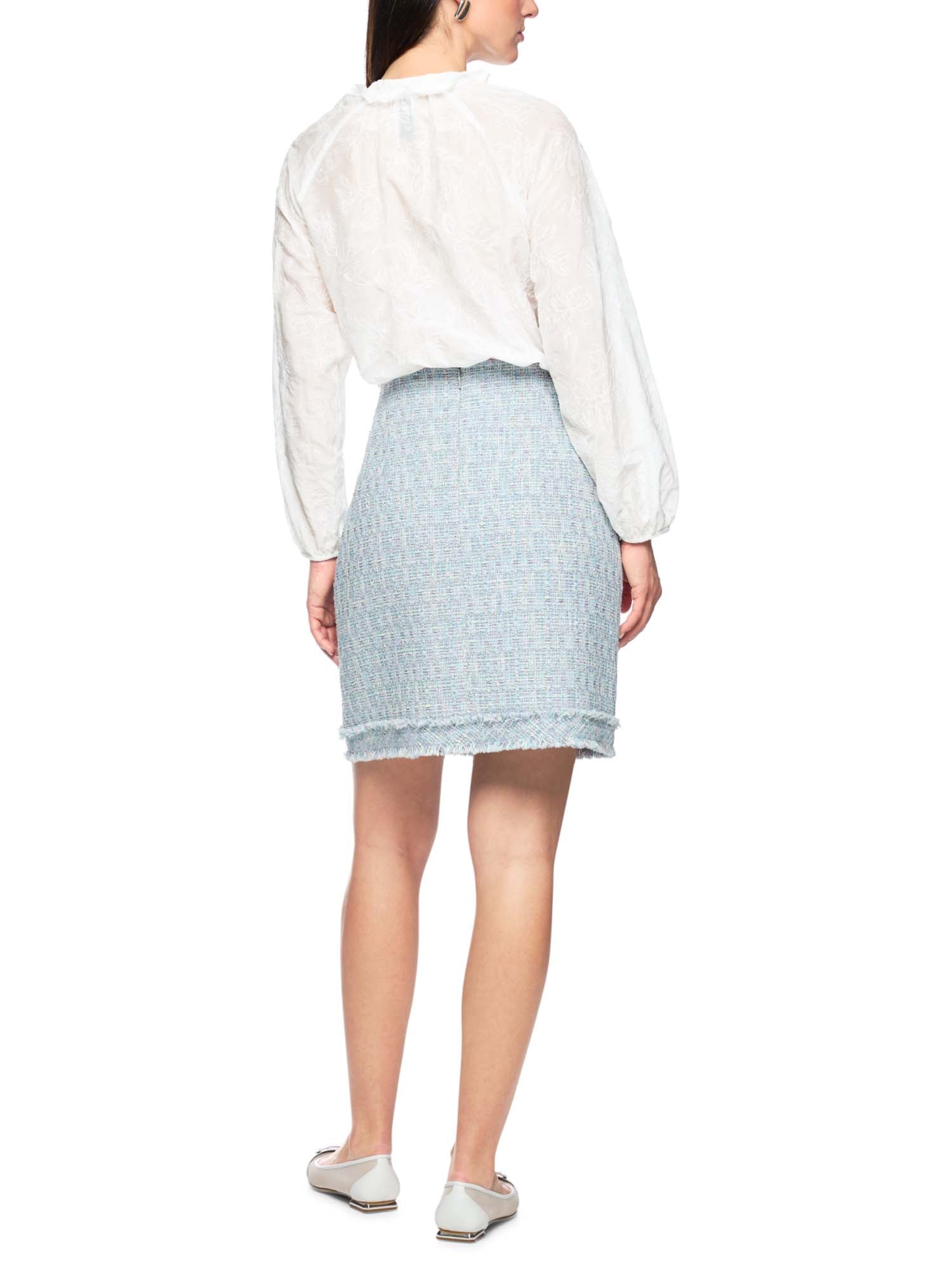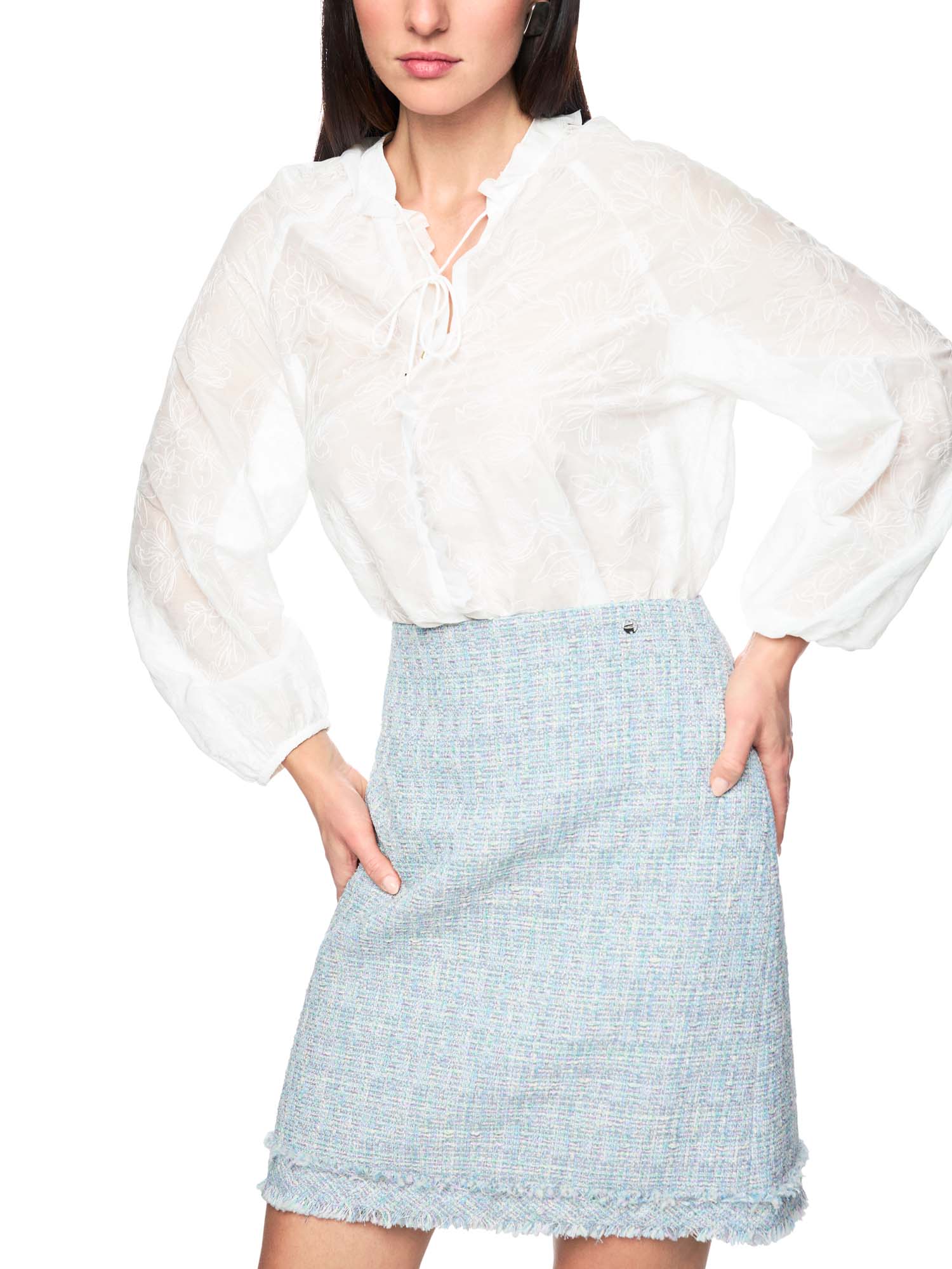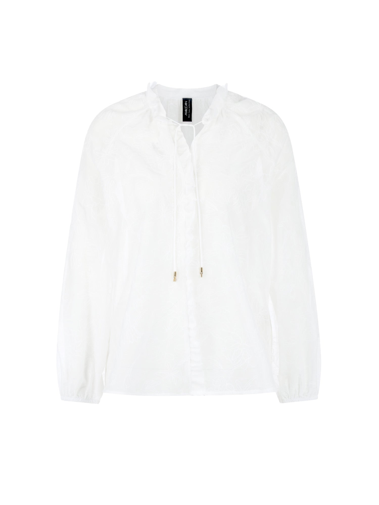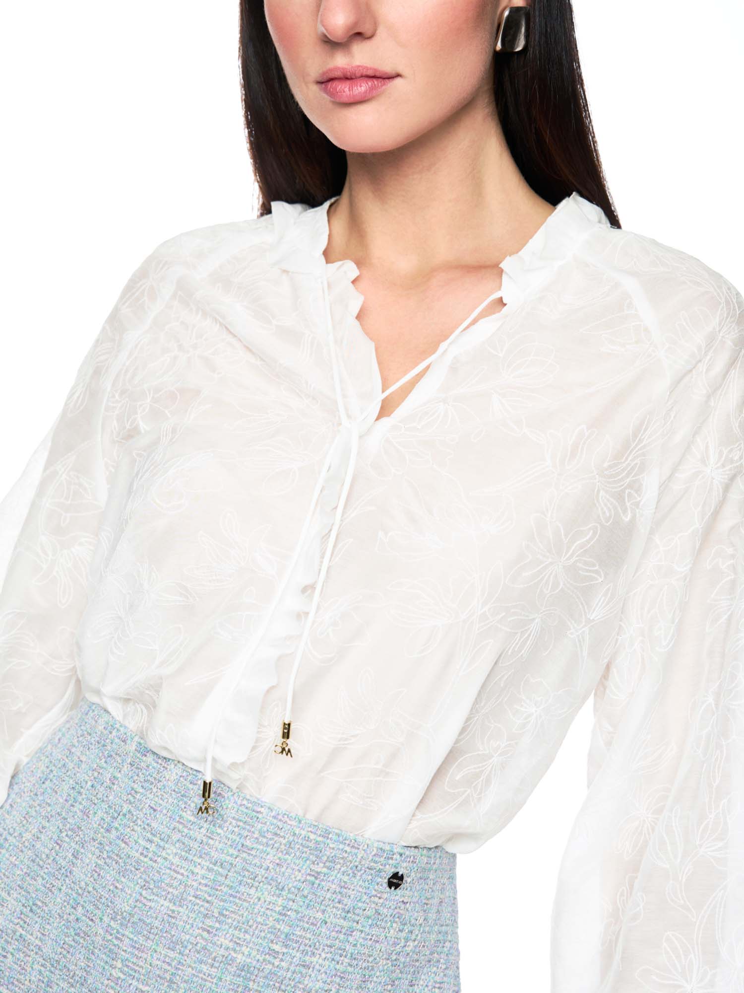 Light tunic with embroidery & ruffles|This delicate, slightly transparent tunic blouse is made from a fine cotton-silk blend. It comes with a delicate all-over embroidered floral design and feminine raglan sleeves. The neckline features ruffles and a tie cord for variable wearing options. Airy, softly draping and ideal for summery, elegant outfits.
