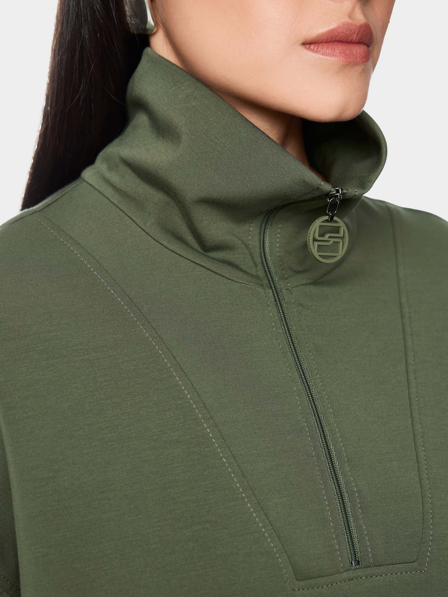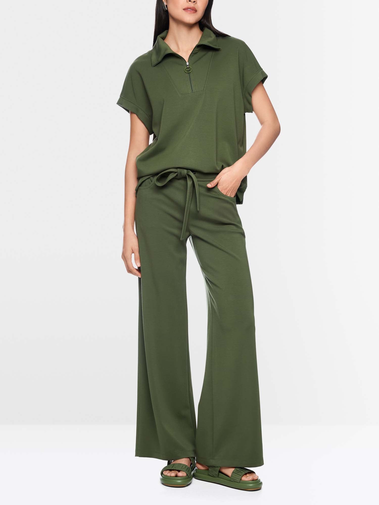Relaxed-fit shirt made from a soft jersey blend with a loose shape. This shirt impresses with its loose cut, short sleeves and collar. The wide waistband and side slits complement the sporty look. The collar has a zip with the Marc Cain Sports logo and can therefore be worn open or as a stand-up collar.