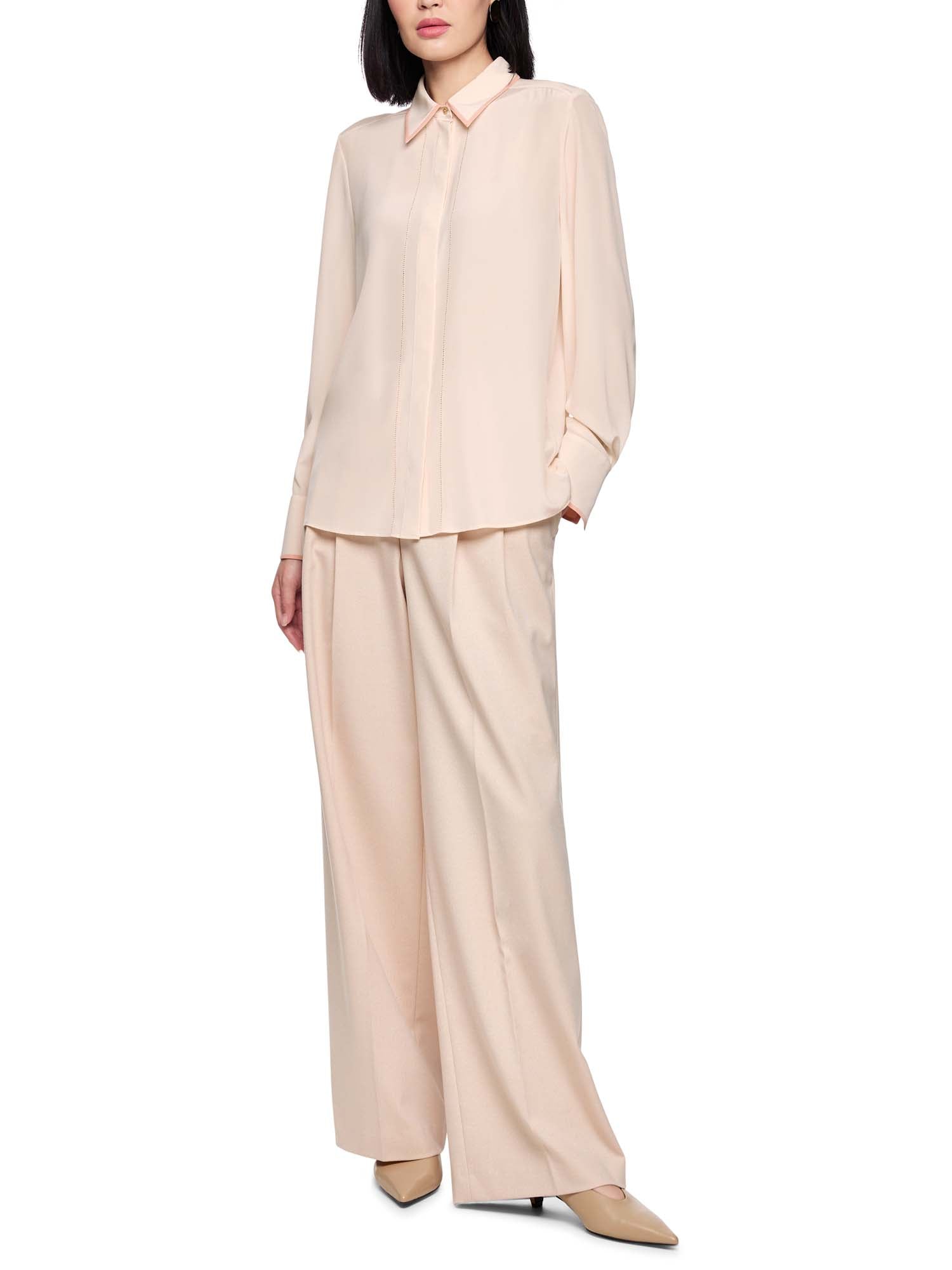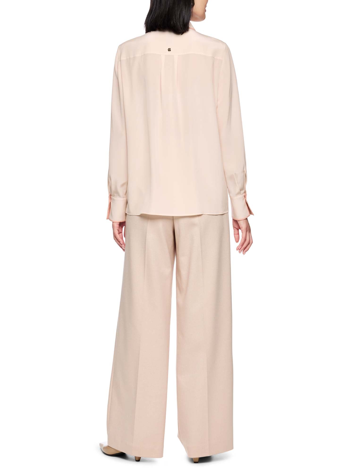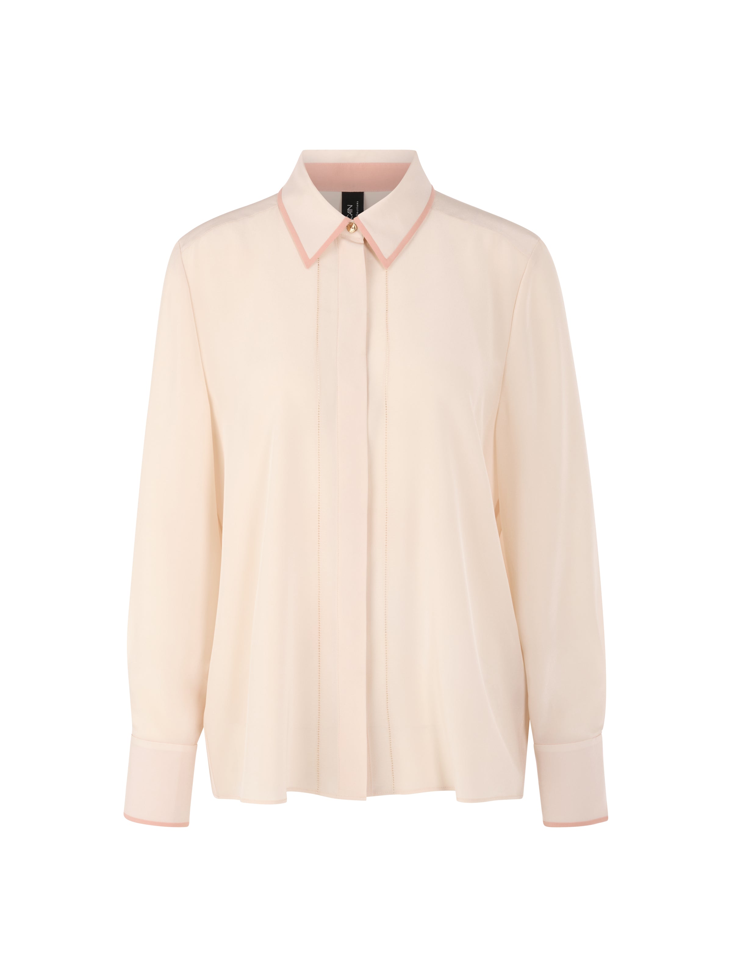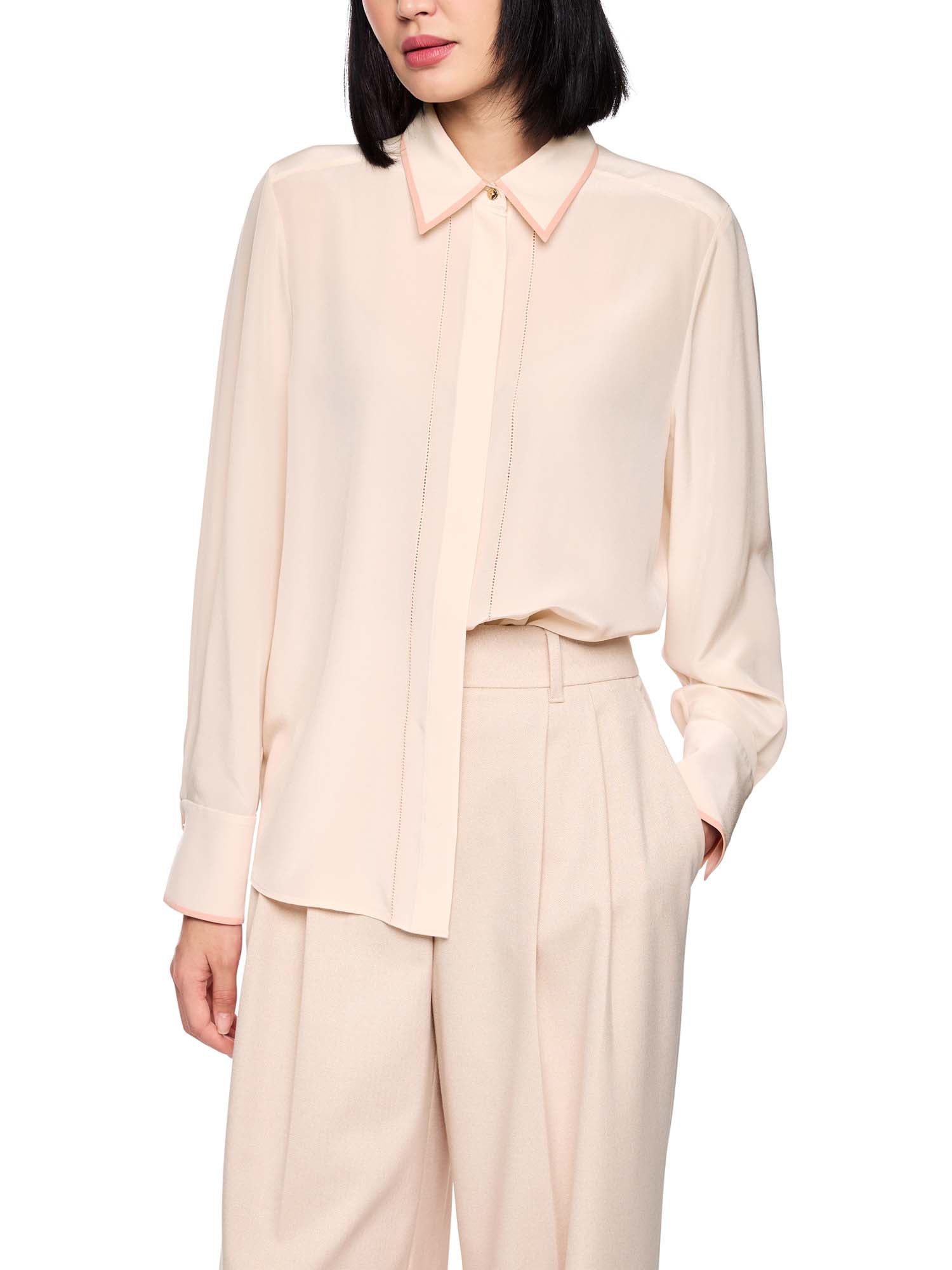 Pure silk shirt collar blouse. Elegant blouse made from pure silk with a classic shirt collar and concealed set of buttons. A gold button on the collar adds a subtle, luxurious accent. Fine contrasting edges on the collar and cuffs emphasise the high-quality look and give this blouse a modern, elegant touch.