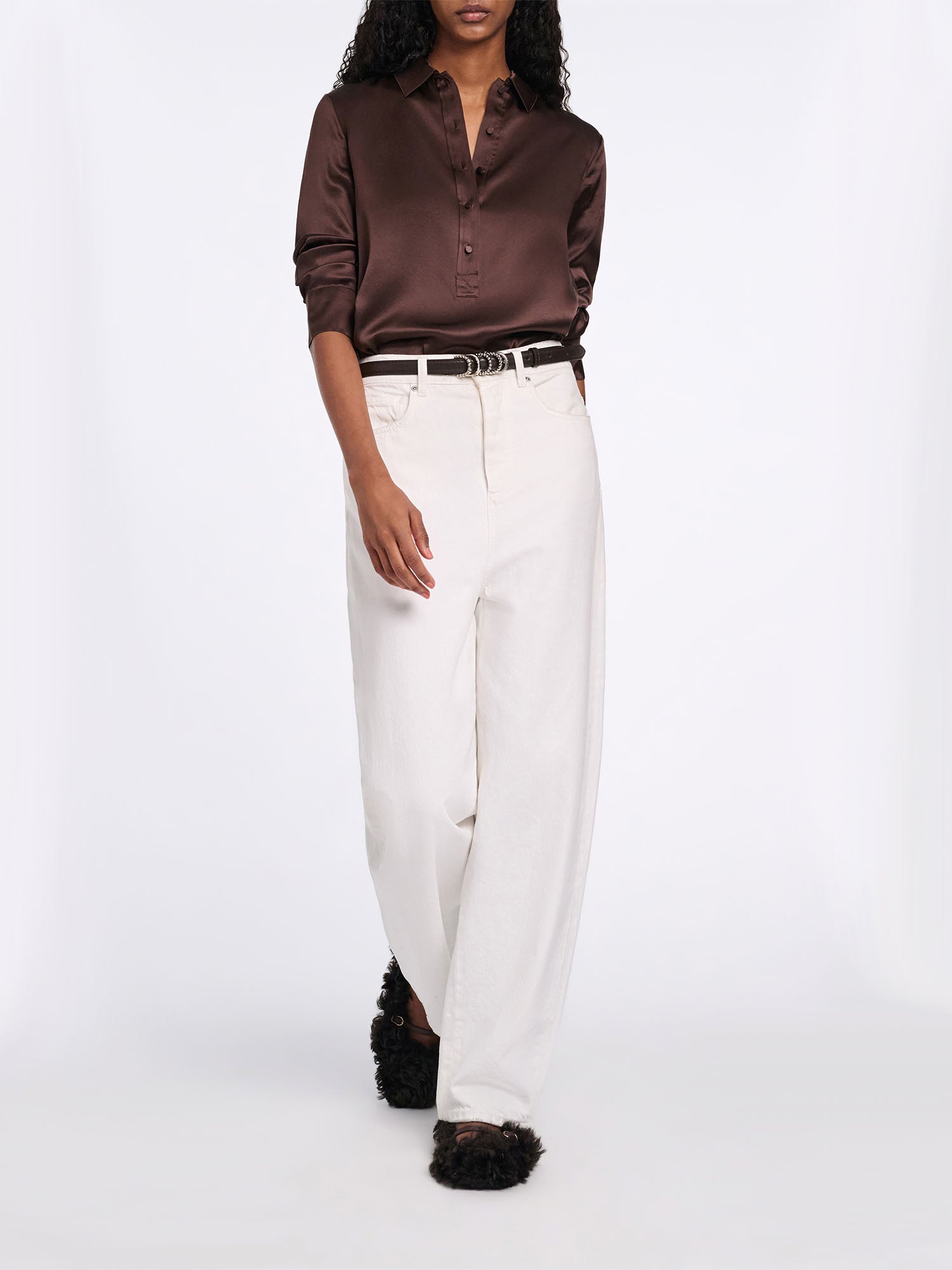 The popover blouse is styled in silk satin and has a relaxed fit.