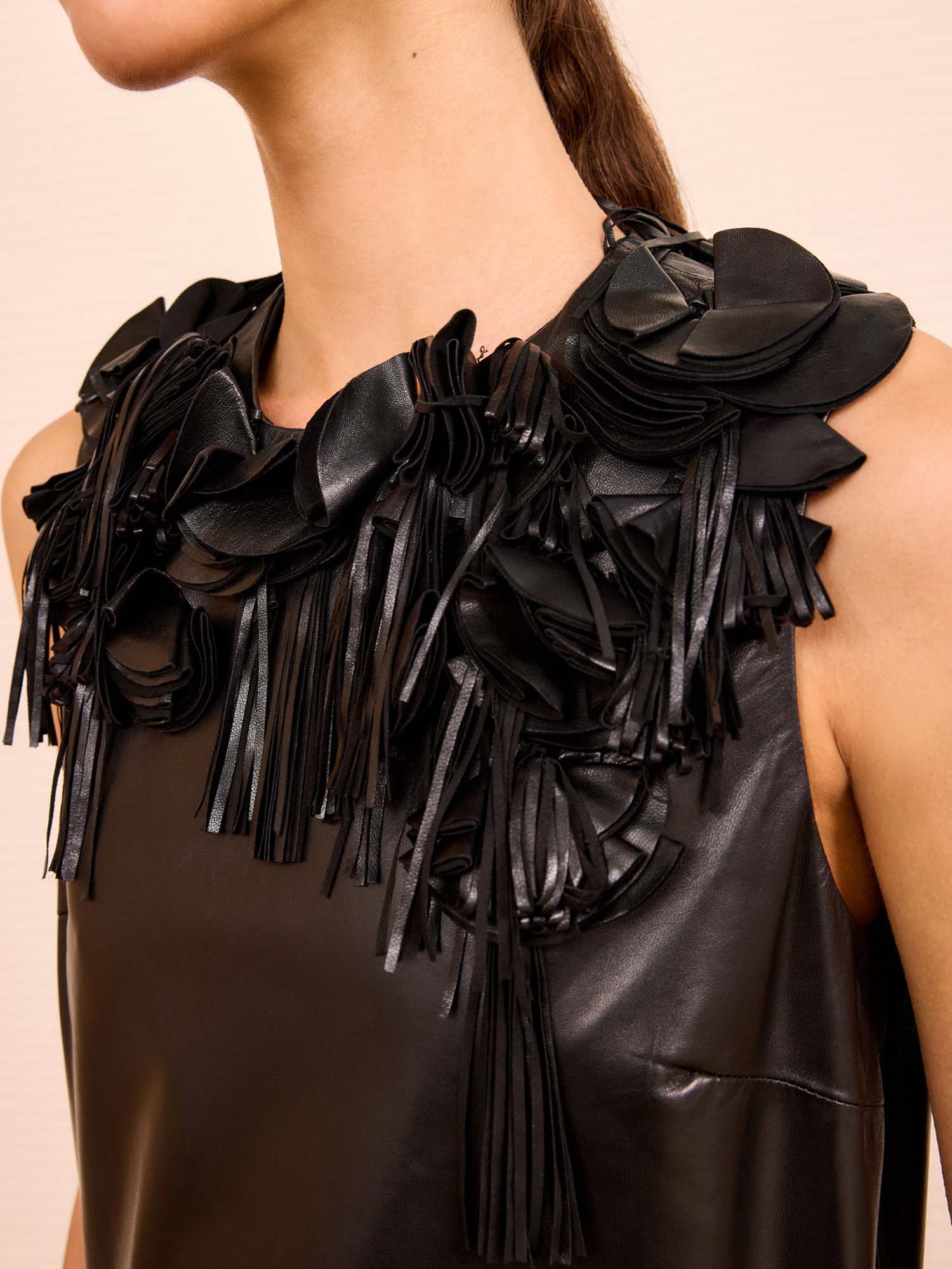 The Marlowe Top is cut from nappa leather in perennial black, enlivened with cutout floral hand-appliqués and tassels that create playful motion. The effortless, relaxed fit is ideal for dressing down with denim, or with tailoring for elevated affairs.