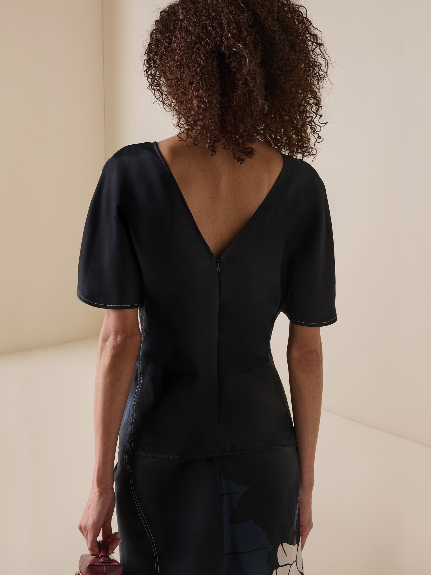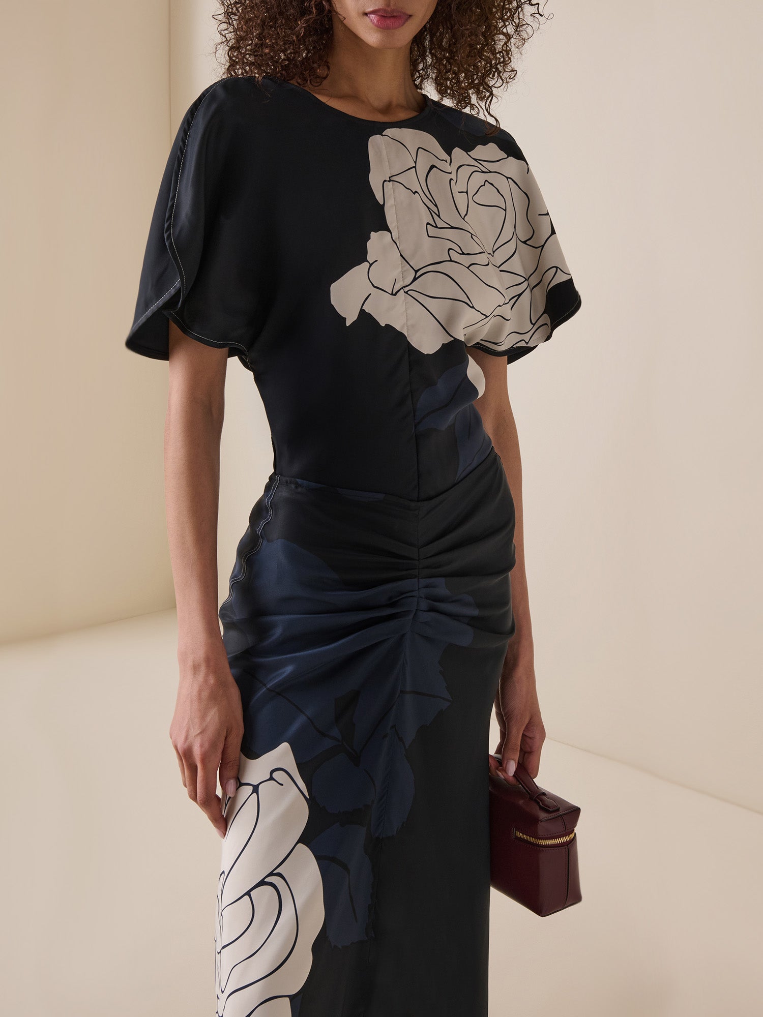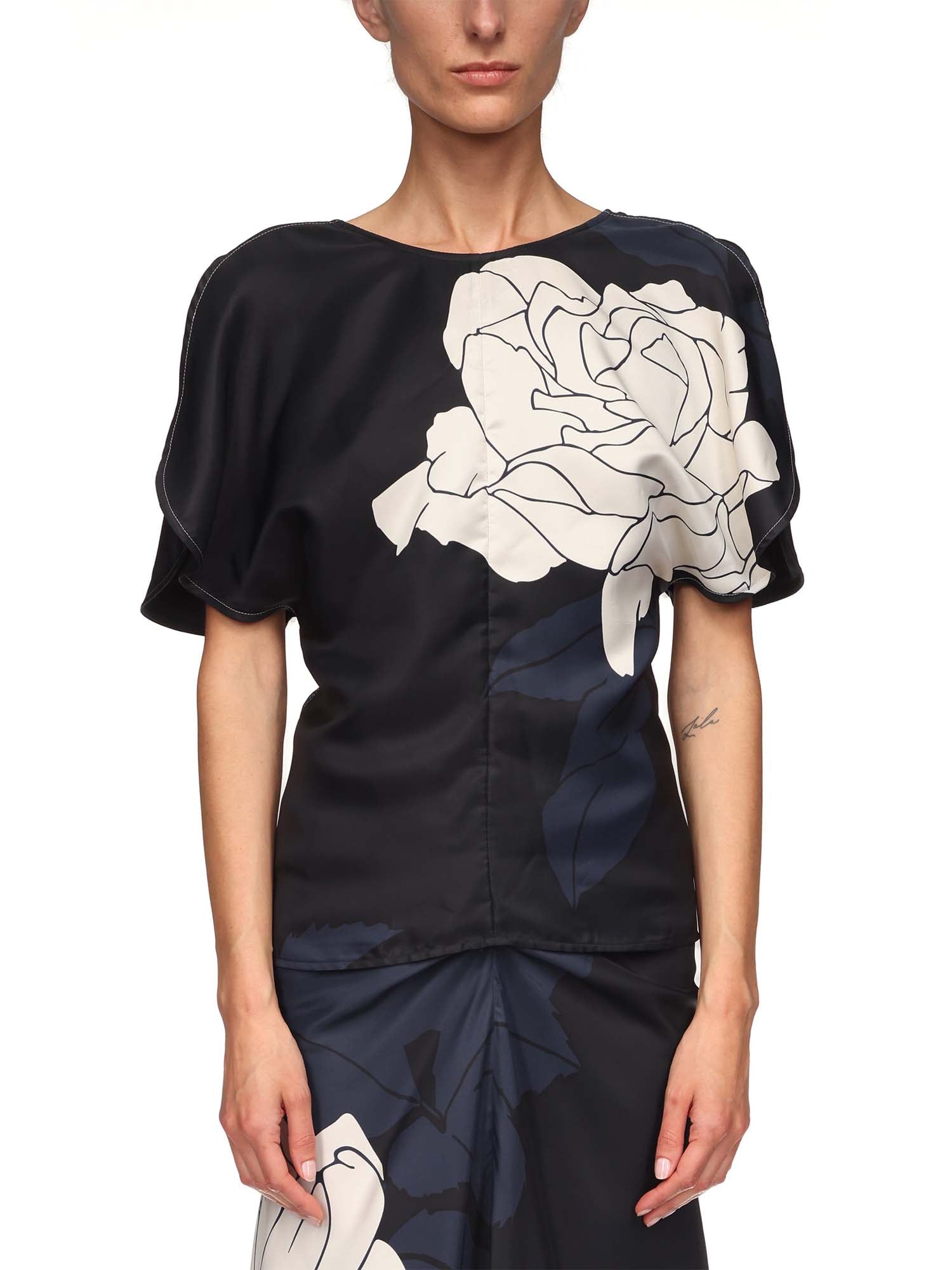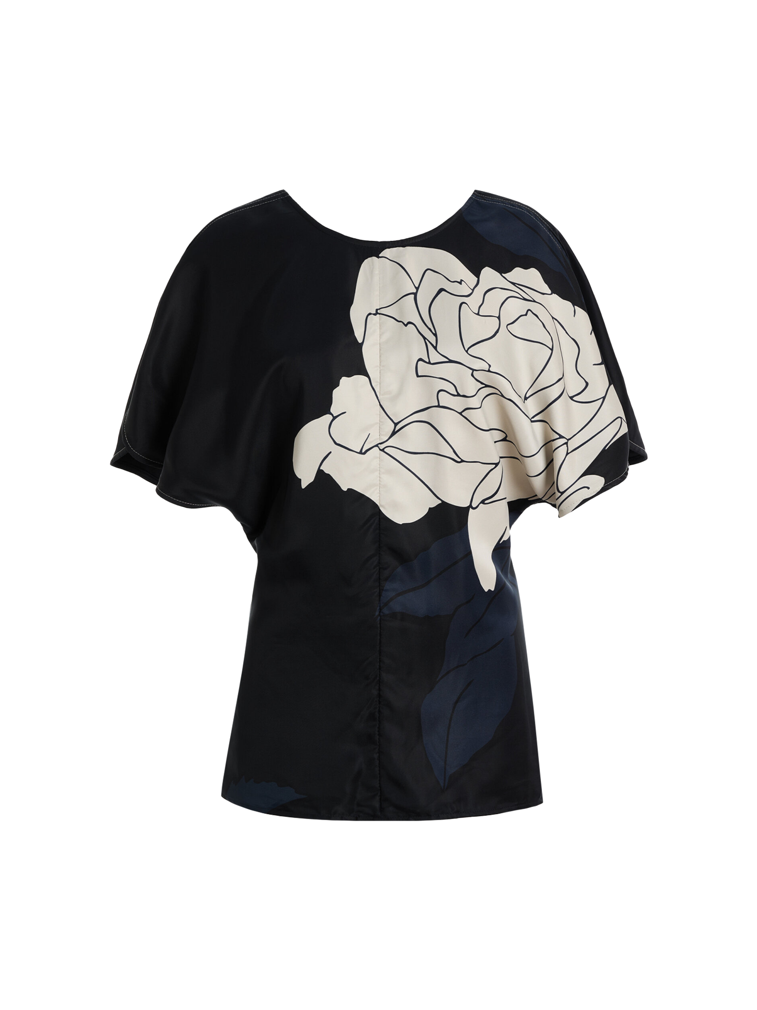 This draped blouse is tailored from dark navy satin, embellished by a large rose printed across half the frame. Its relaxed neckline and sleeves are balanced by a close fit around the waist and hips. Wear with the coordinating skirt.