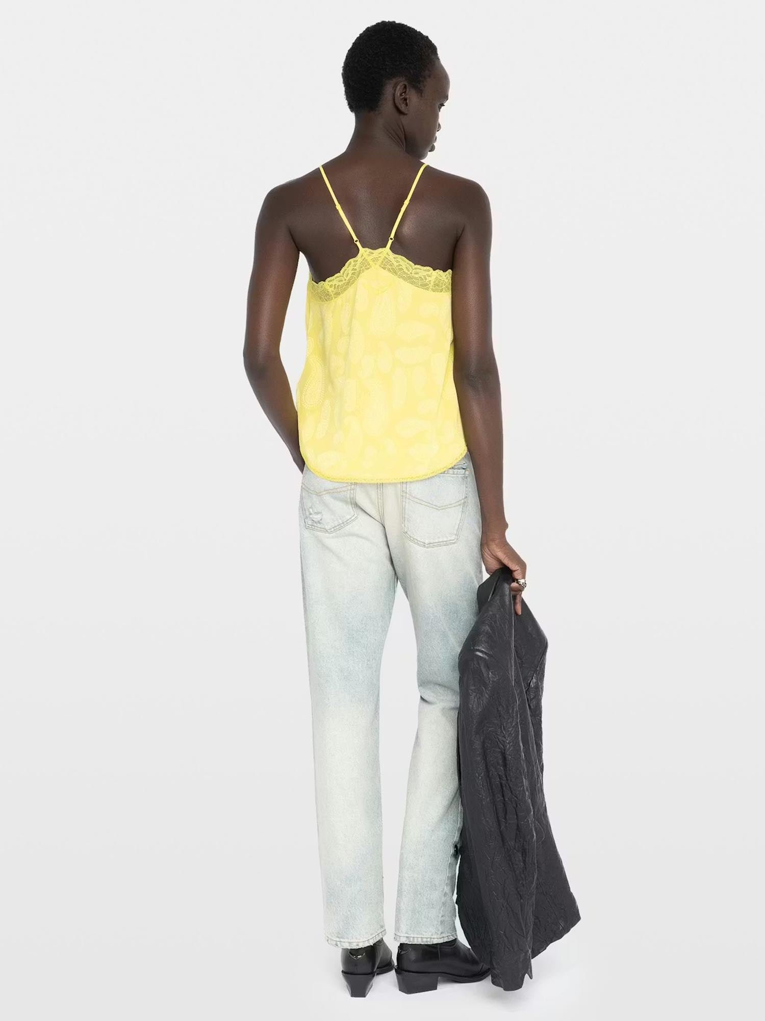 Jacquard silk camisole, adjustable straps, embroidered wings on the back and French lace.