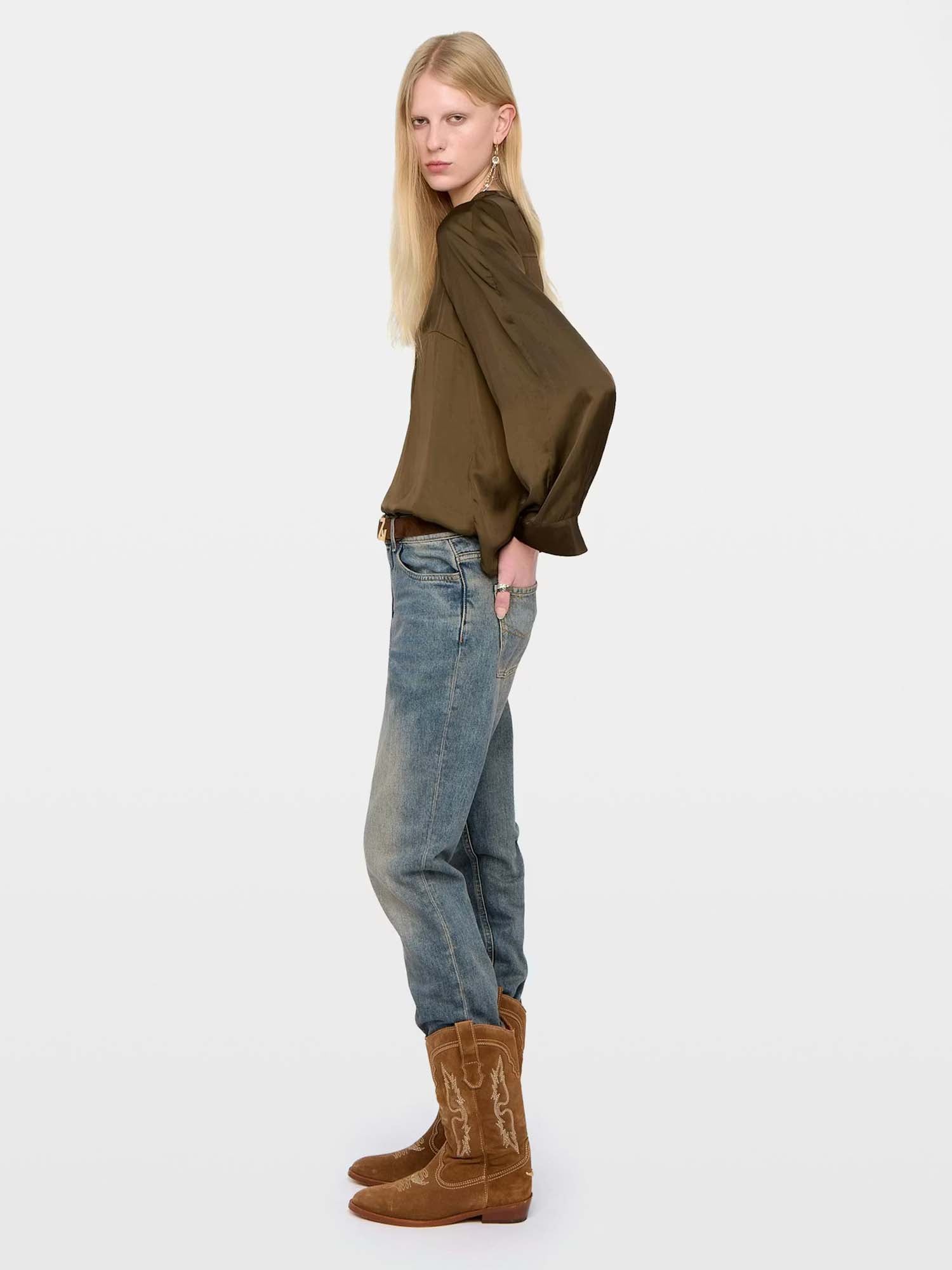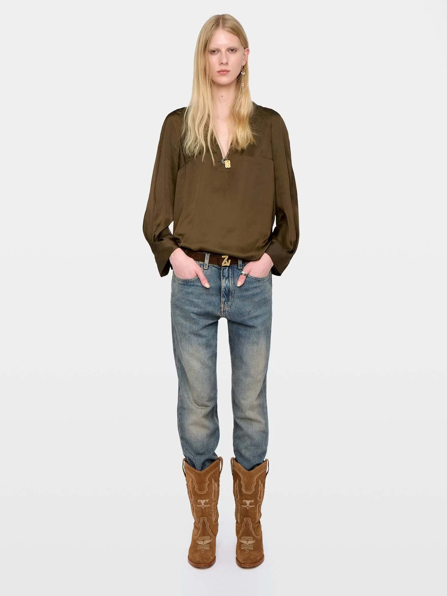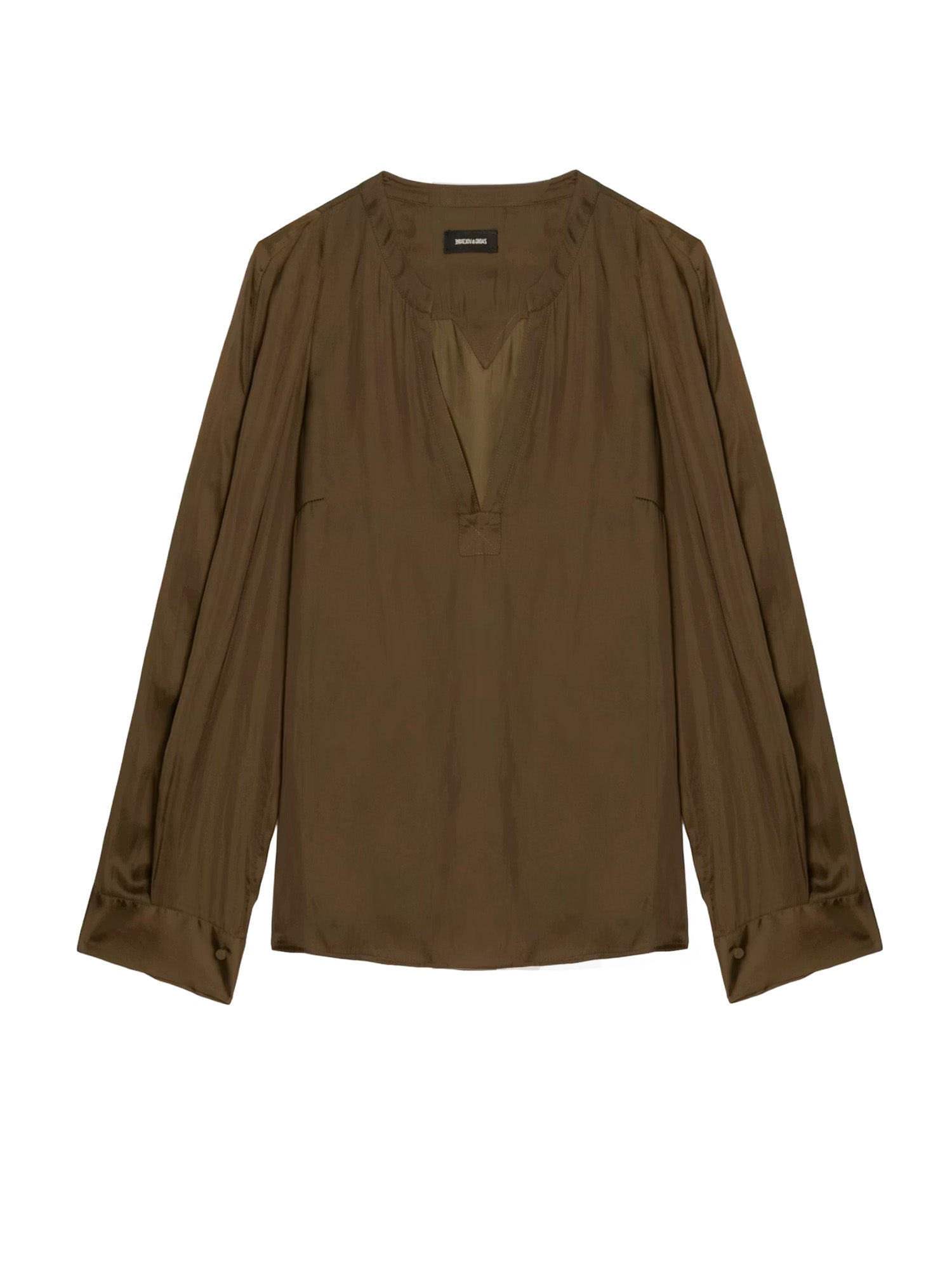 Japanese satin tunic with long sleeves and a refined V-neck, finished in a rich moss tone. Effortlessly fluid and elegant, it offers a timeless silhouette with a modern, luxurious feel.