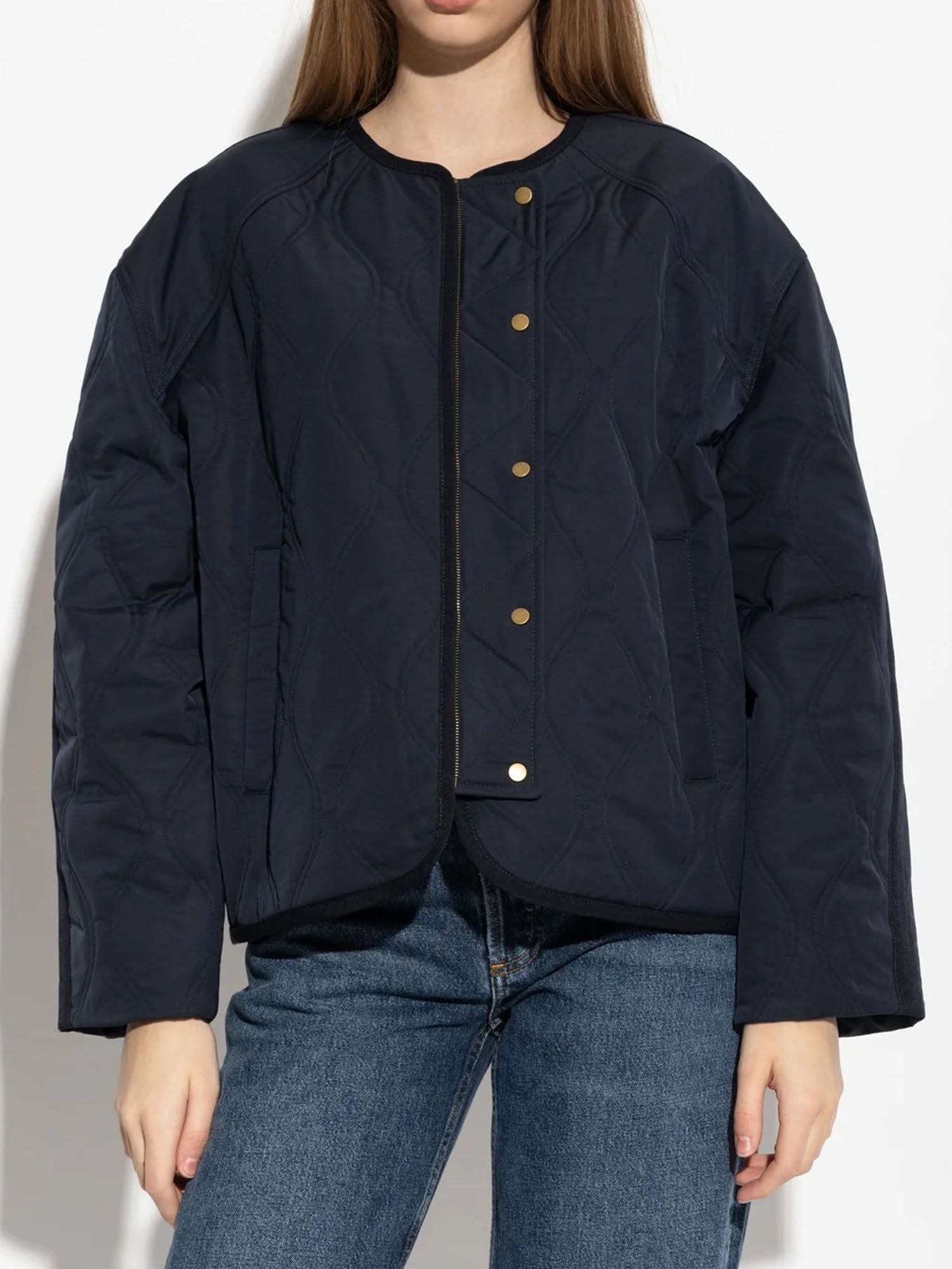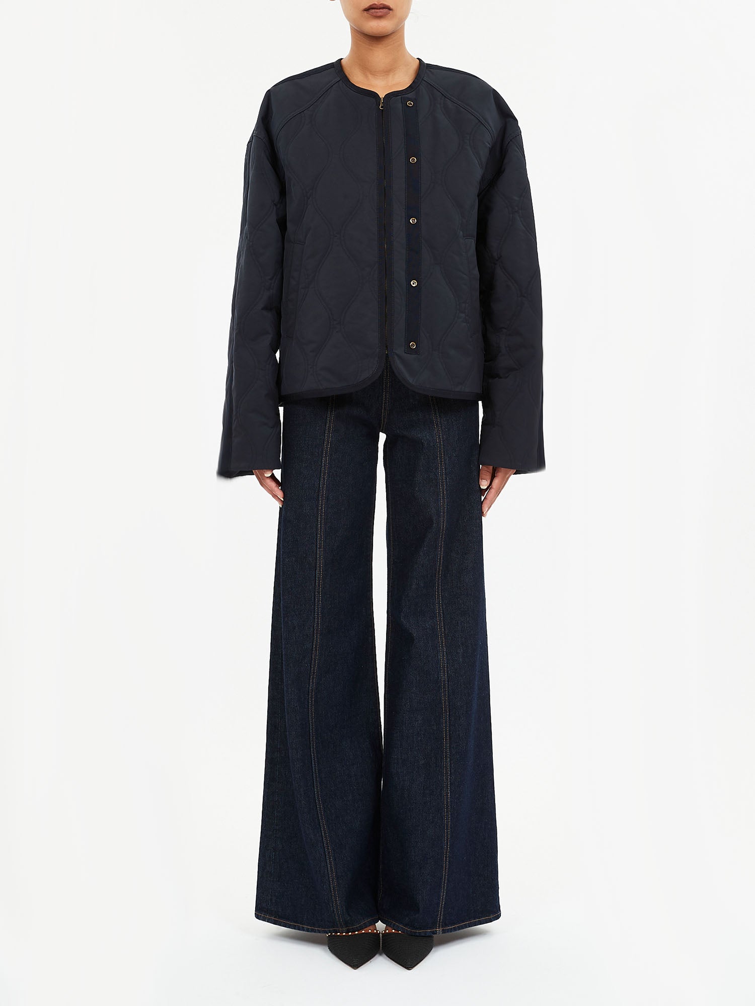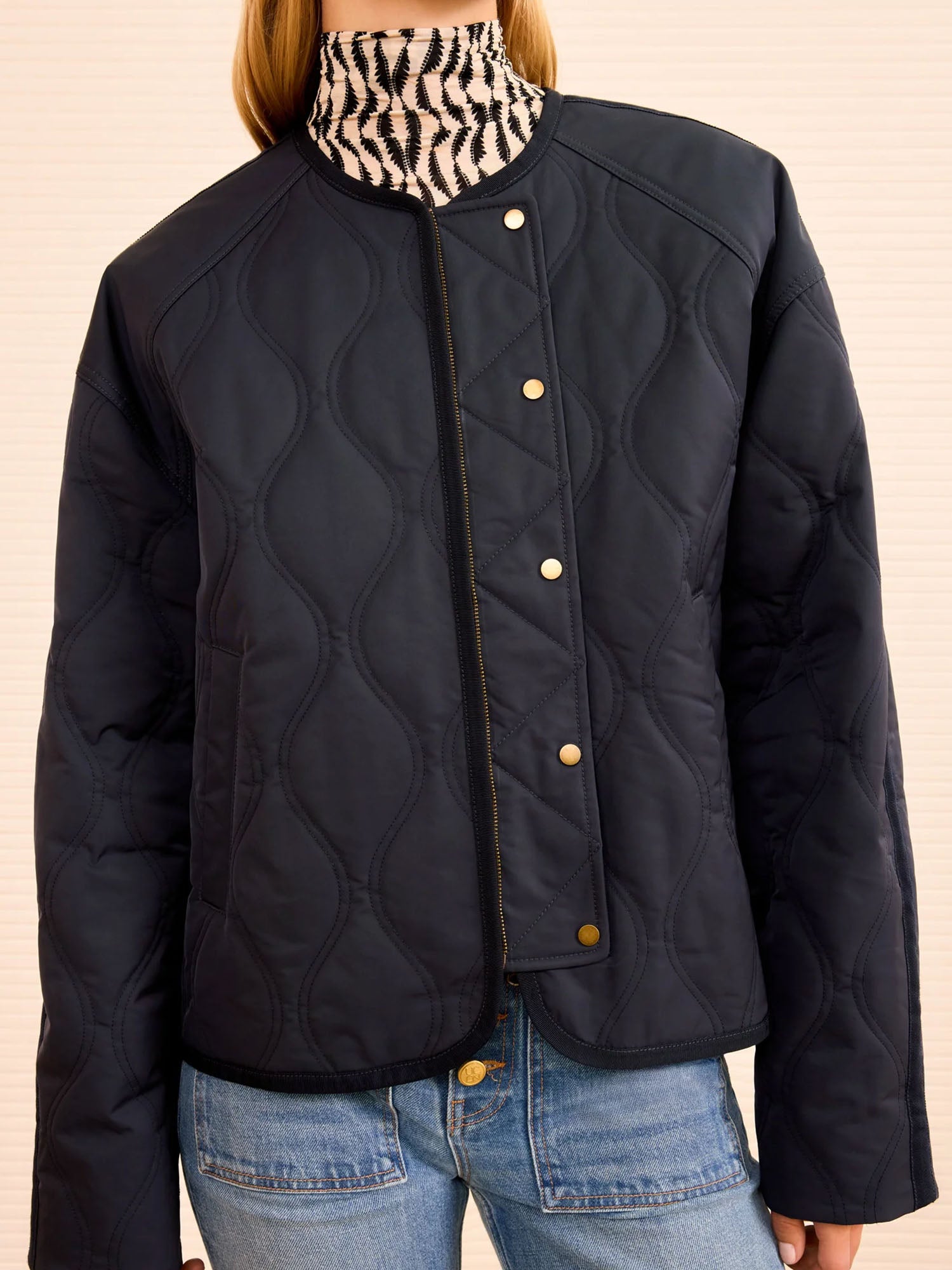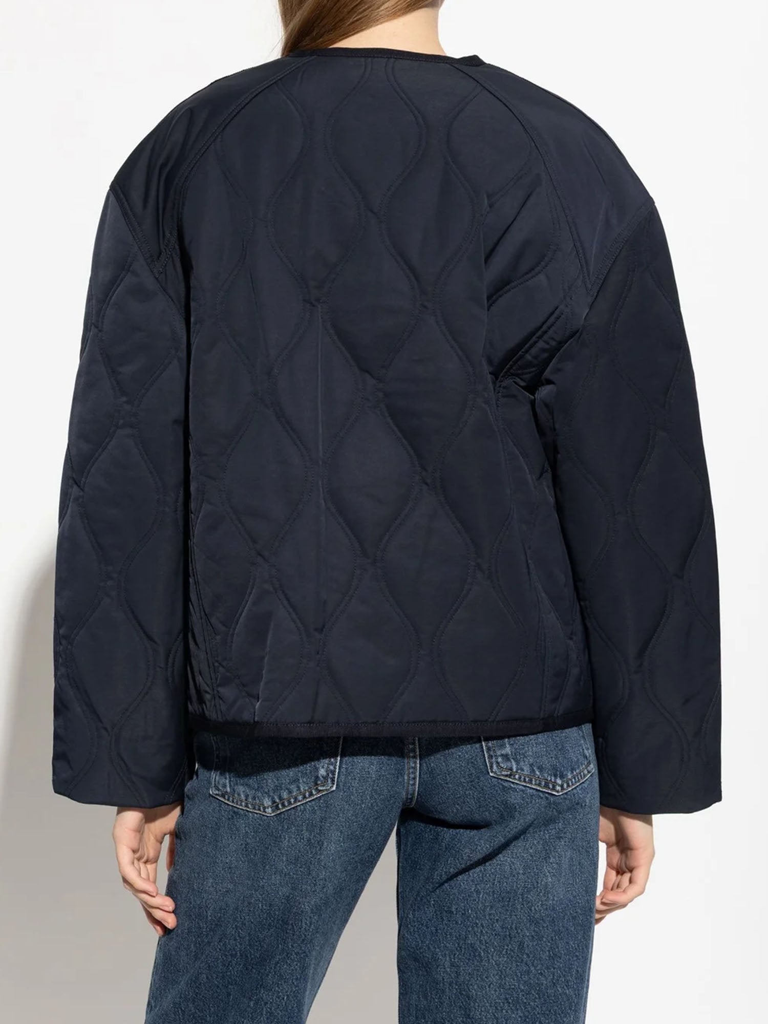 The Malone Jacket is a nylon outerwear essential in rich midnight blue. Quilted throughout, this jacket has a clean, collarless silhouette and an oversized fit ideal for layering.
