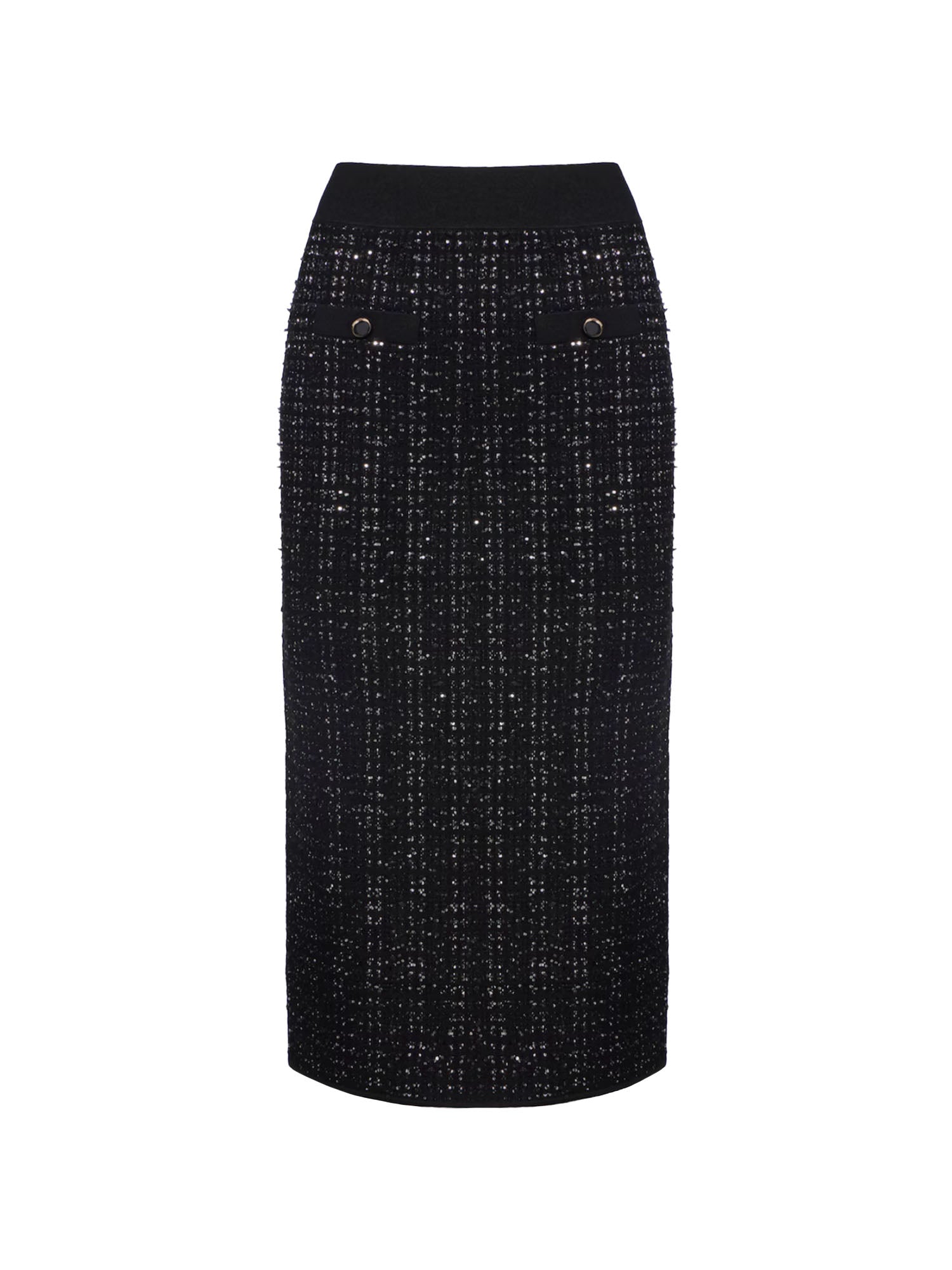 The Corbin midi skirt is crafted from a flexible tweed and is complete with a subtly elasticated waistband.