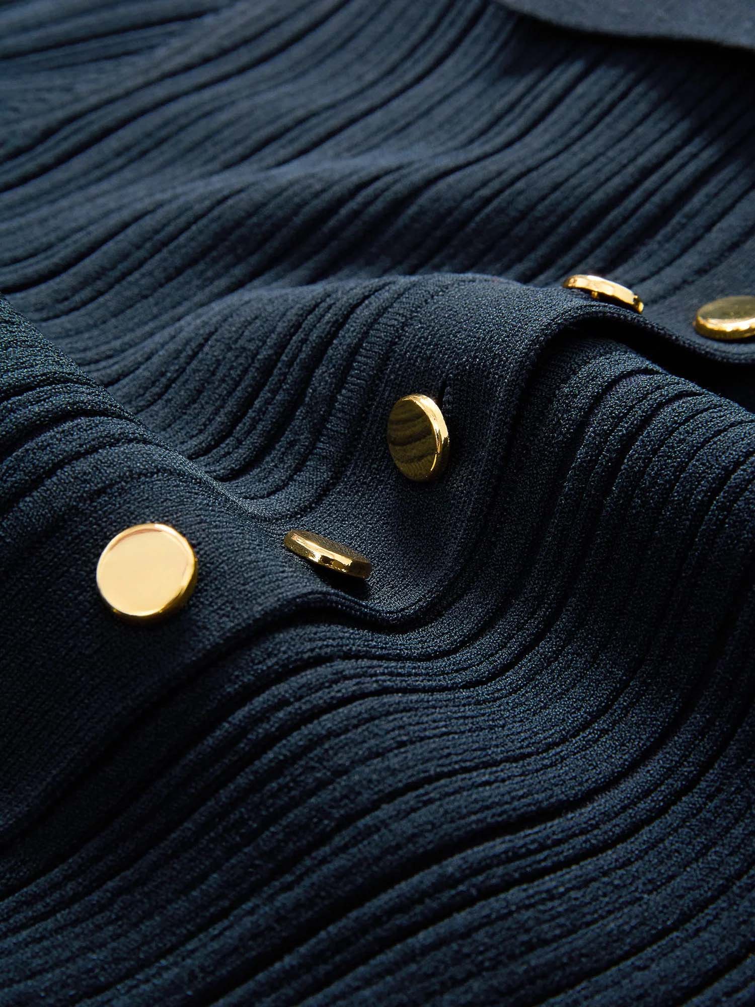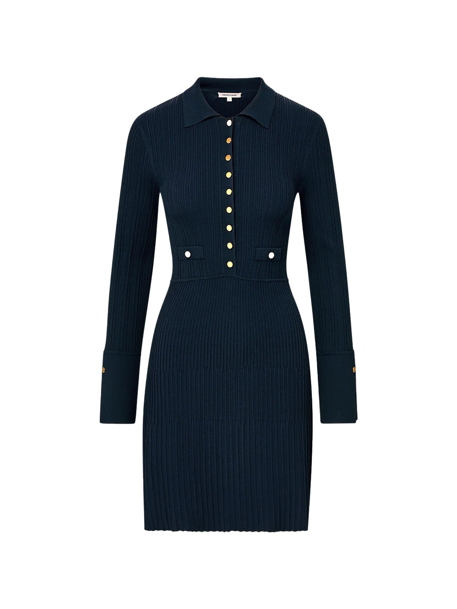 The ultimate 9-to-9 dress, the Lauper is refined enough for the office and cool enough for cocktails. Spun from a navy ribbed stretch-knit, it features a fitted mini silhouette and a trim collar that flows into a half-placket of gold buttons. Faux front pockets and elongated cuffs complete the look. A one-and-done style for instant polish, pair it with heels, flats, sneakers...you name it.