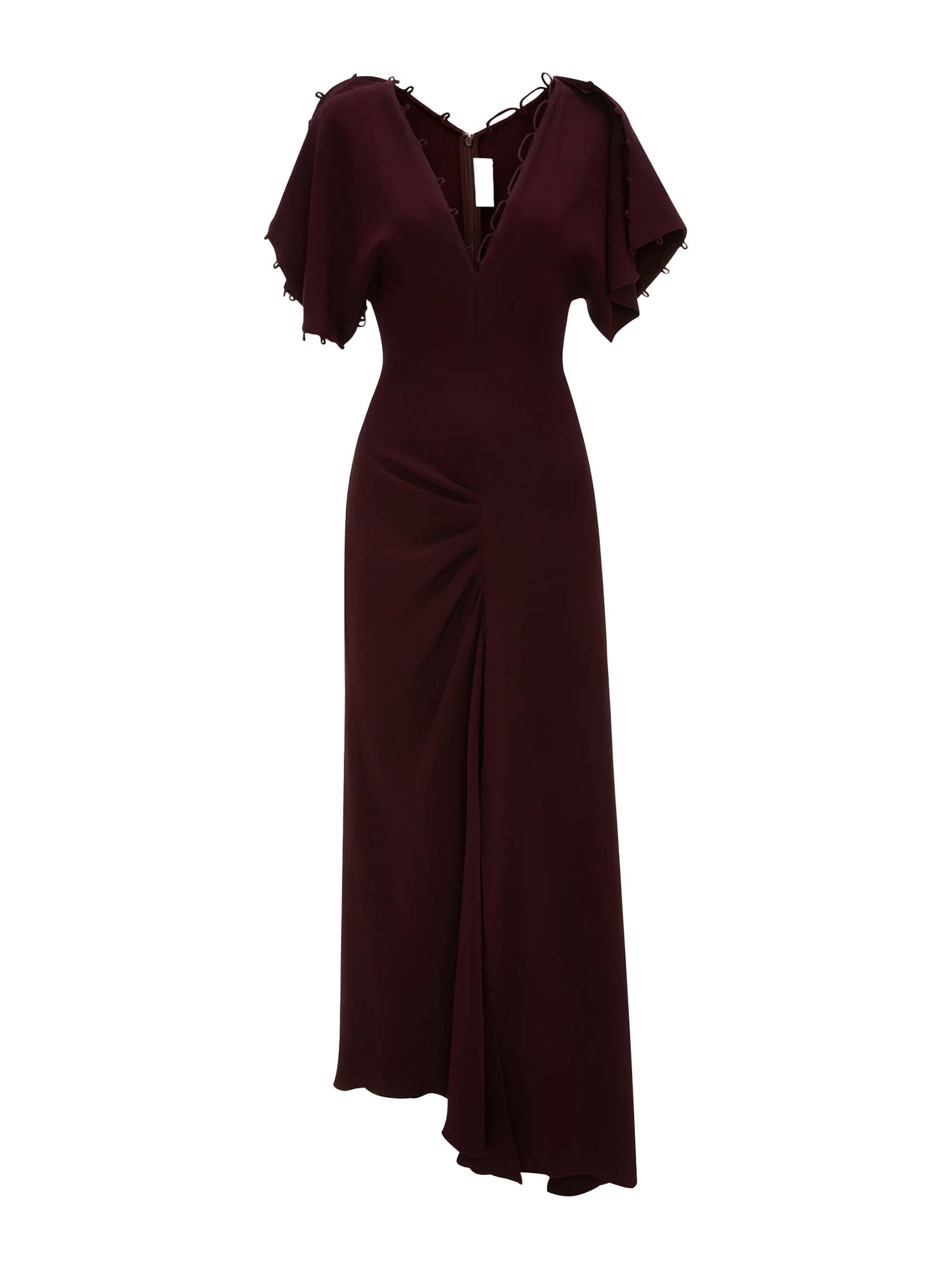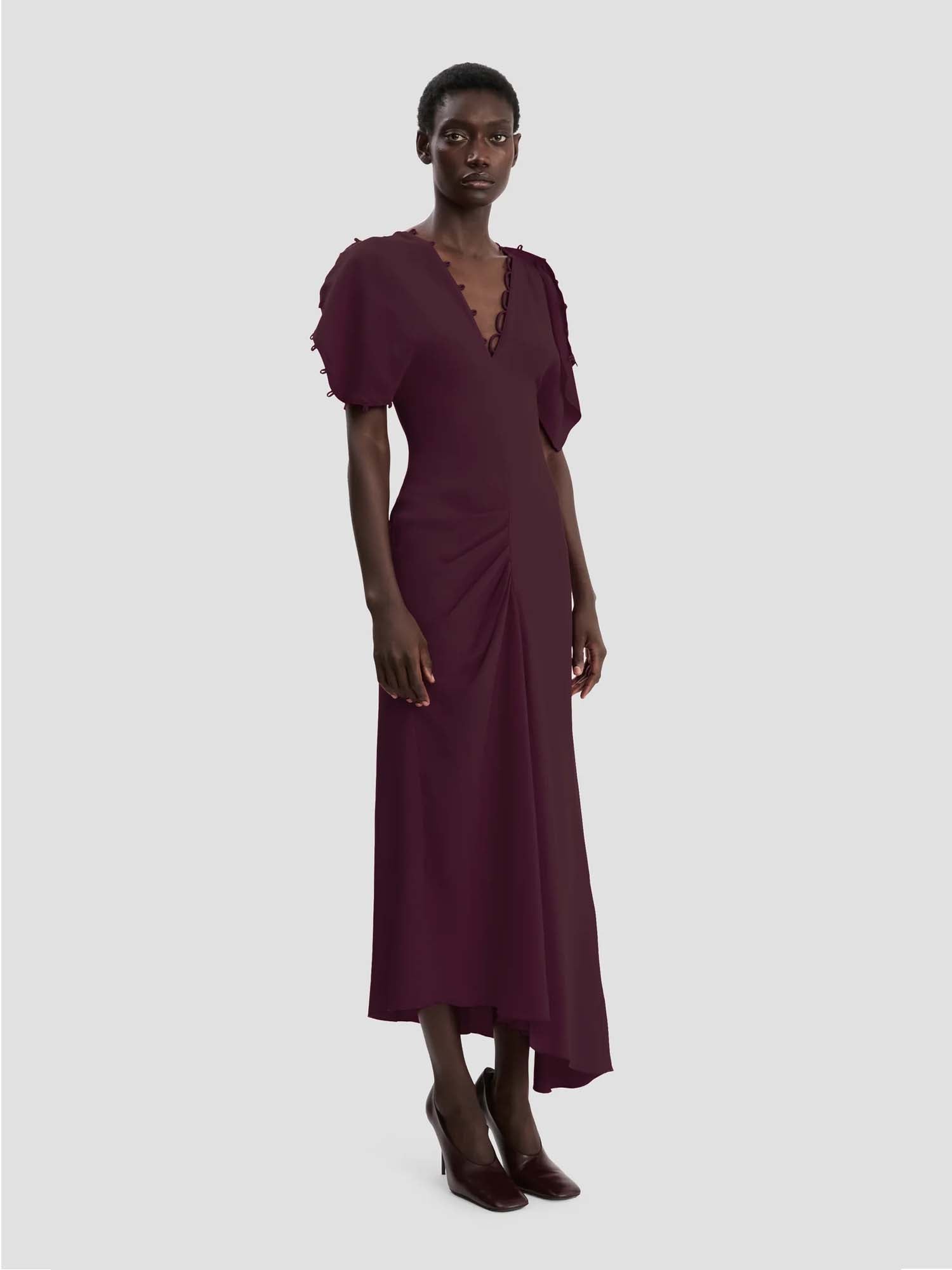 A refined rouleaux detail at the sleeves and neckline add a discreet but distinctive element to this sophisticated midi dress. Presented in rich Merlot, it has a fitted bodice, waist and hip and a pleat detail skirt for a beautifully feminine silhouette. Crafted from crepe back satin, it embodies the house’s contemporary flair. Elegant draped sleeves and a sensuous V neckline complete the look.