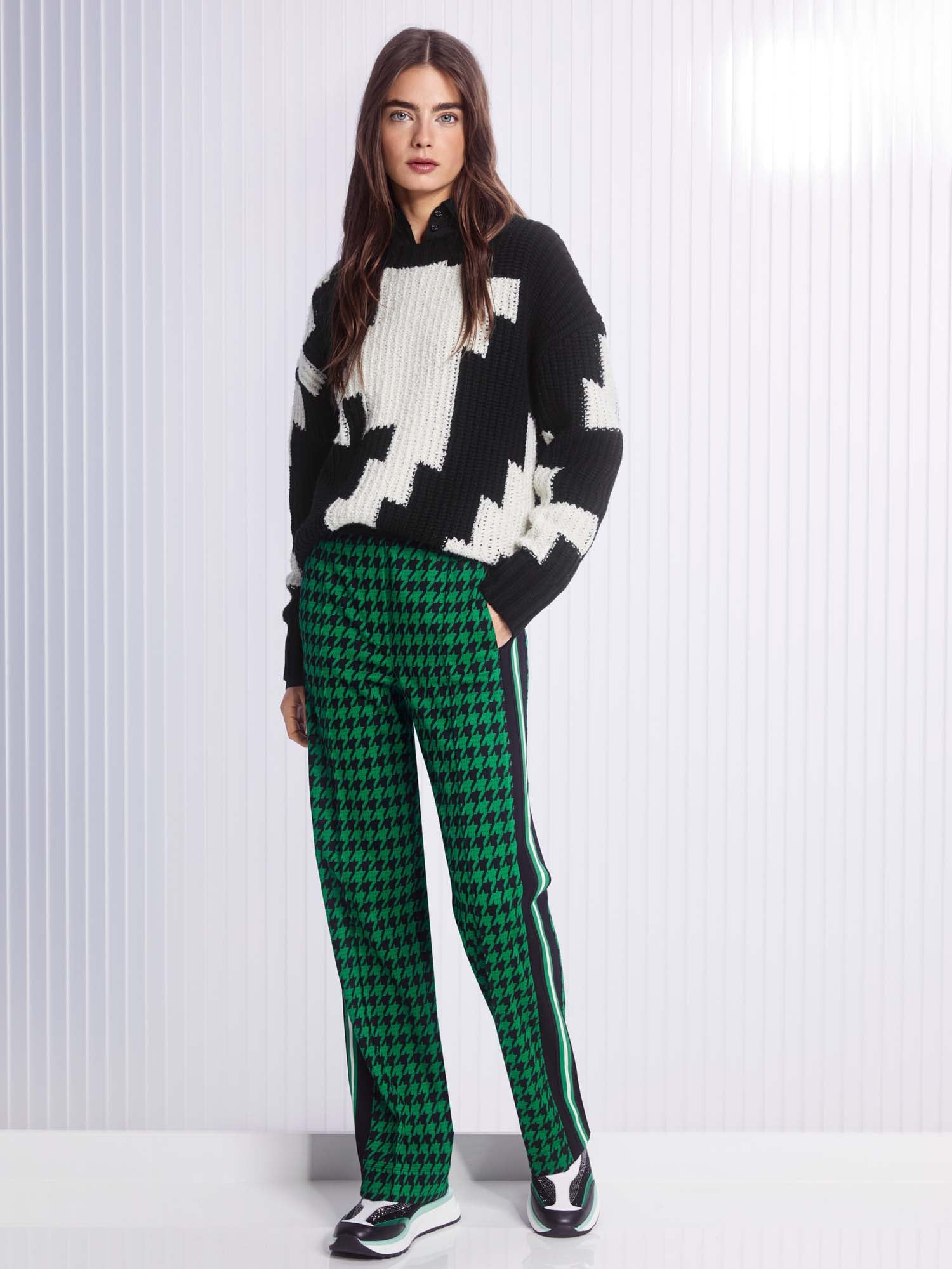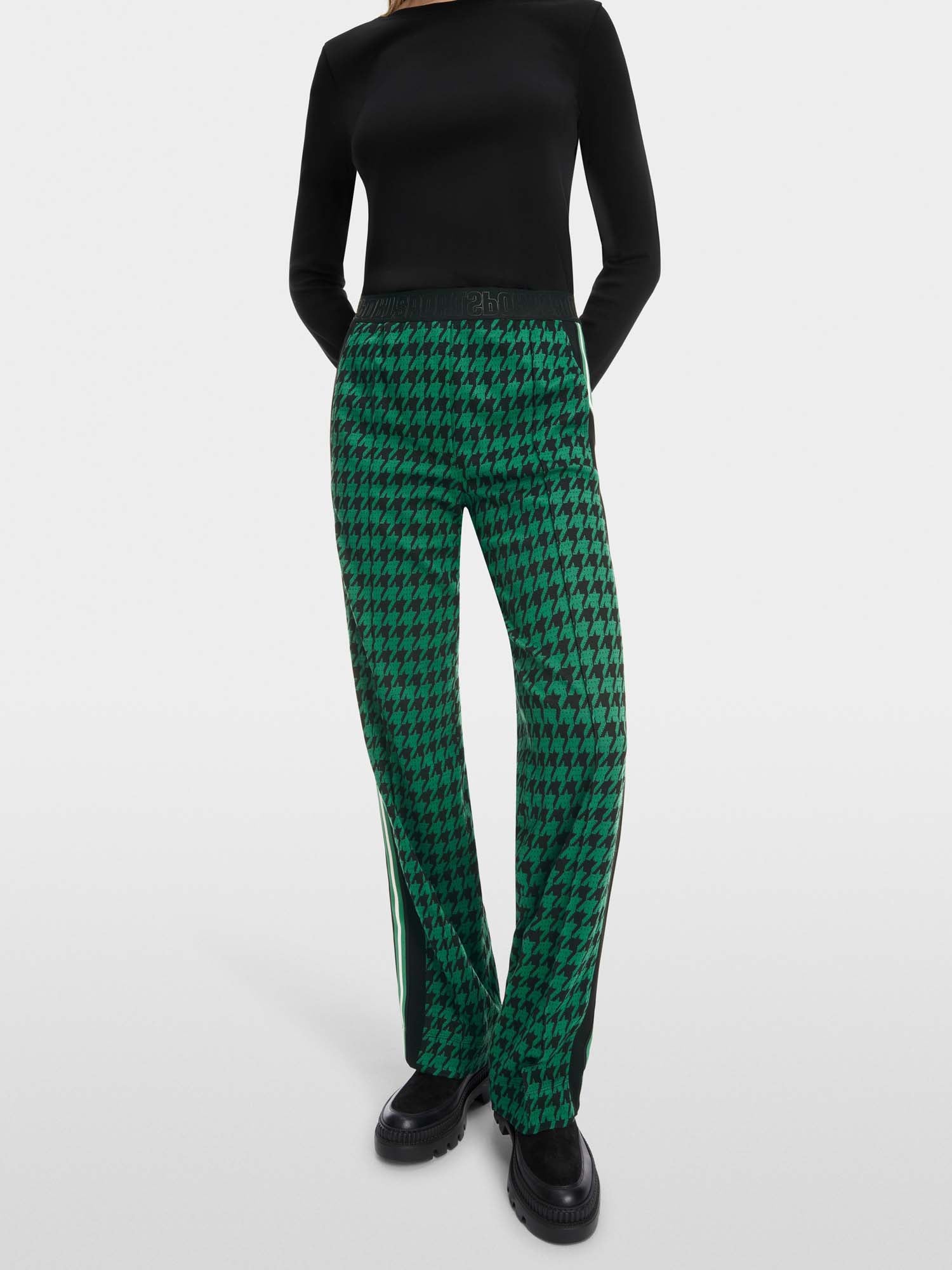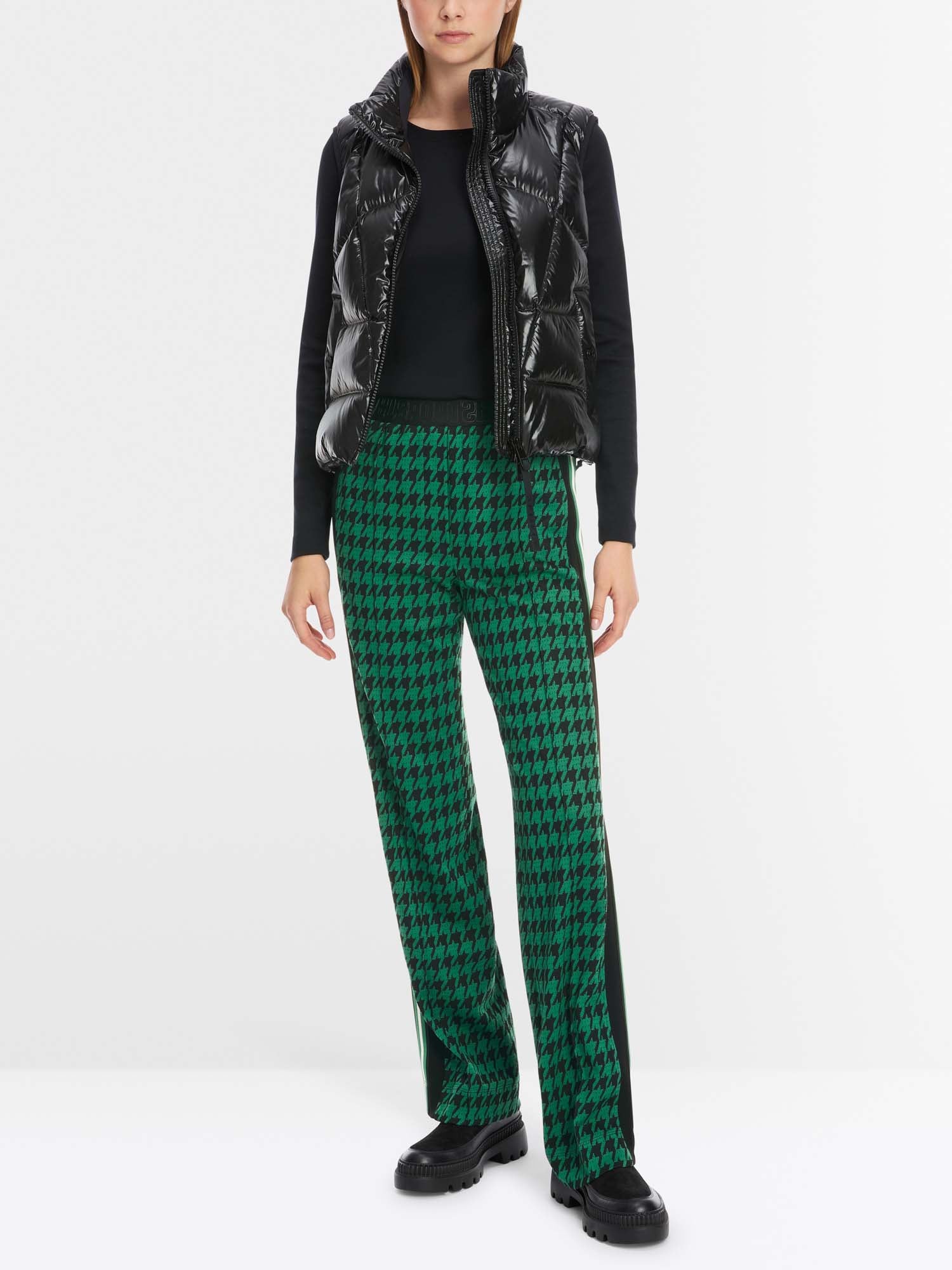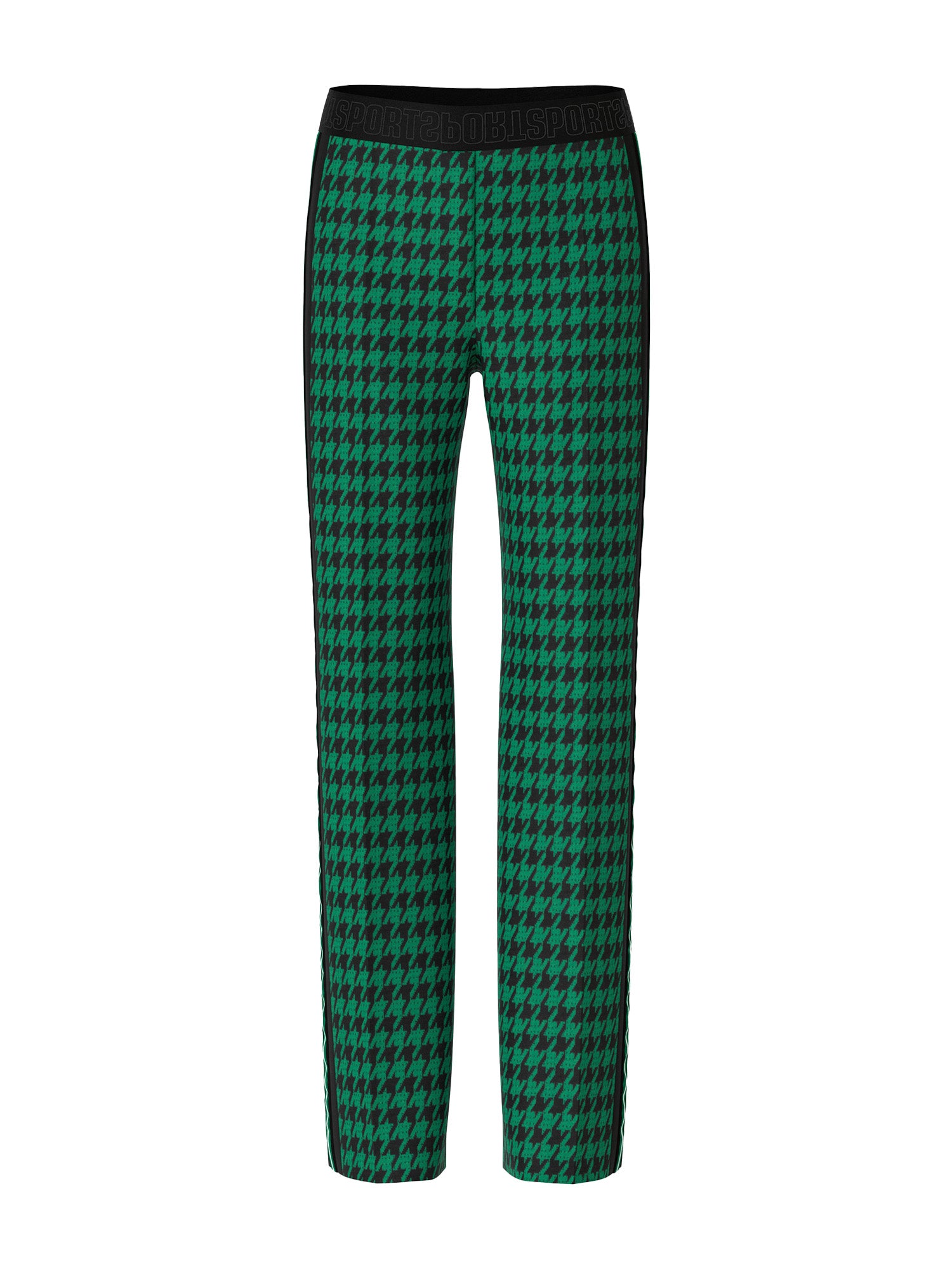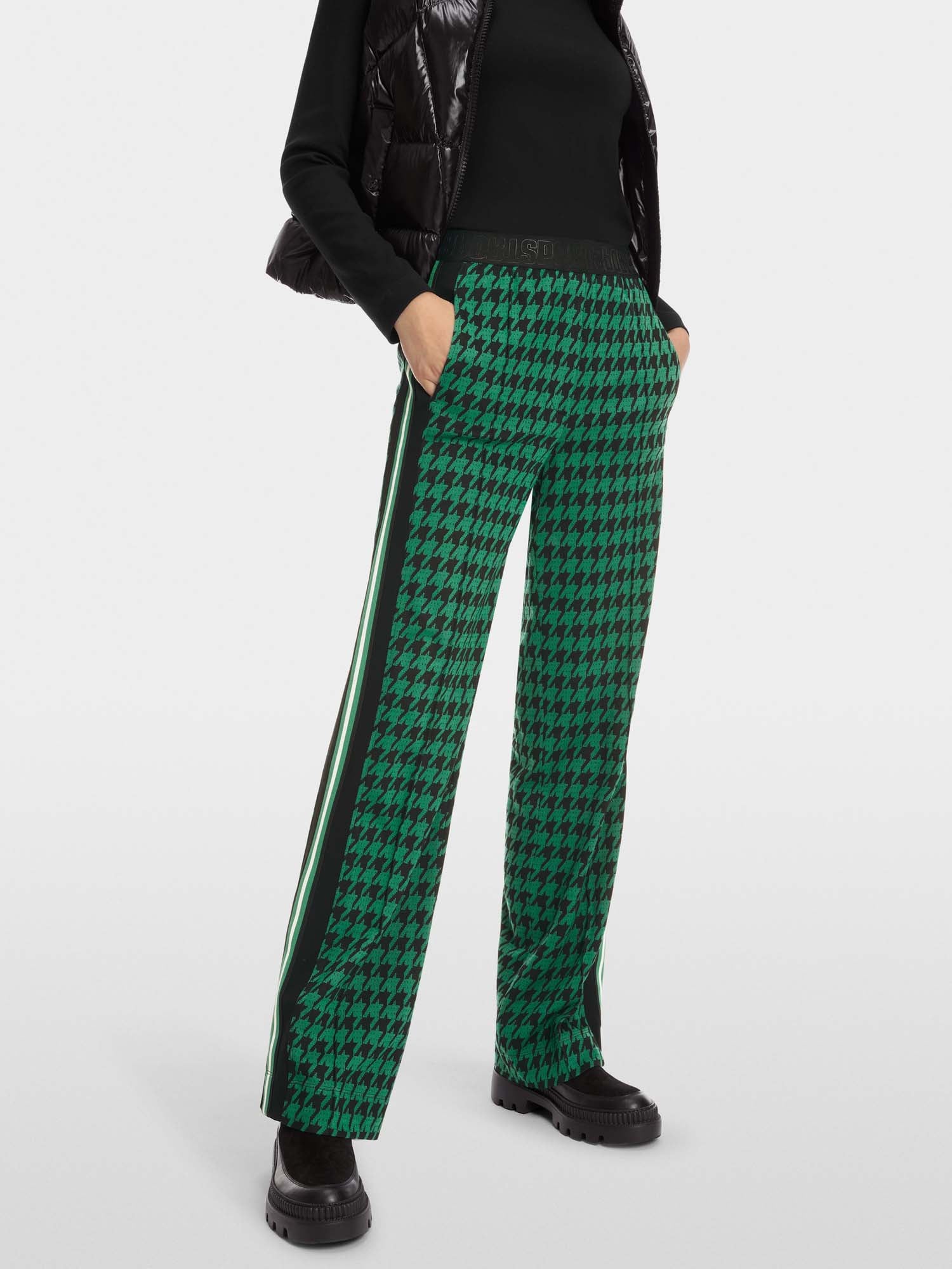 Straight-cut trousers with a wide-leg silhouette, the WELBY feature a large-scale chickcheck pattern. The sporty highlights include the side stripes. These relaxed slip-on trousers are also equipped with a comfortable elastic waistband at a regular height, decorated with a Marc Cain logo. The soft viscose mix contains a small amount of elastane for added comfort.
