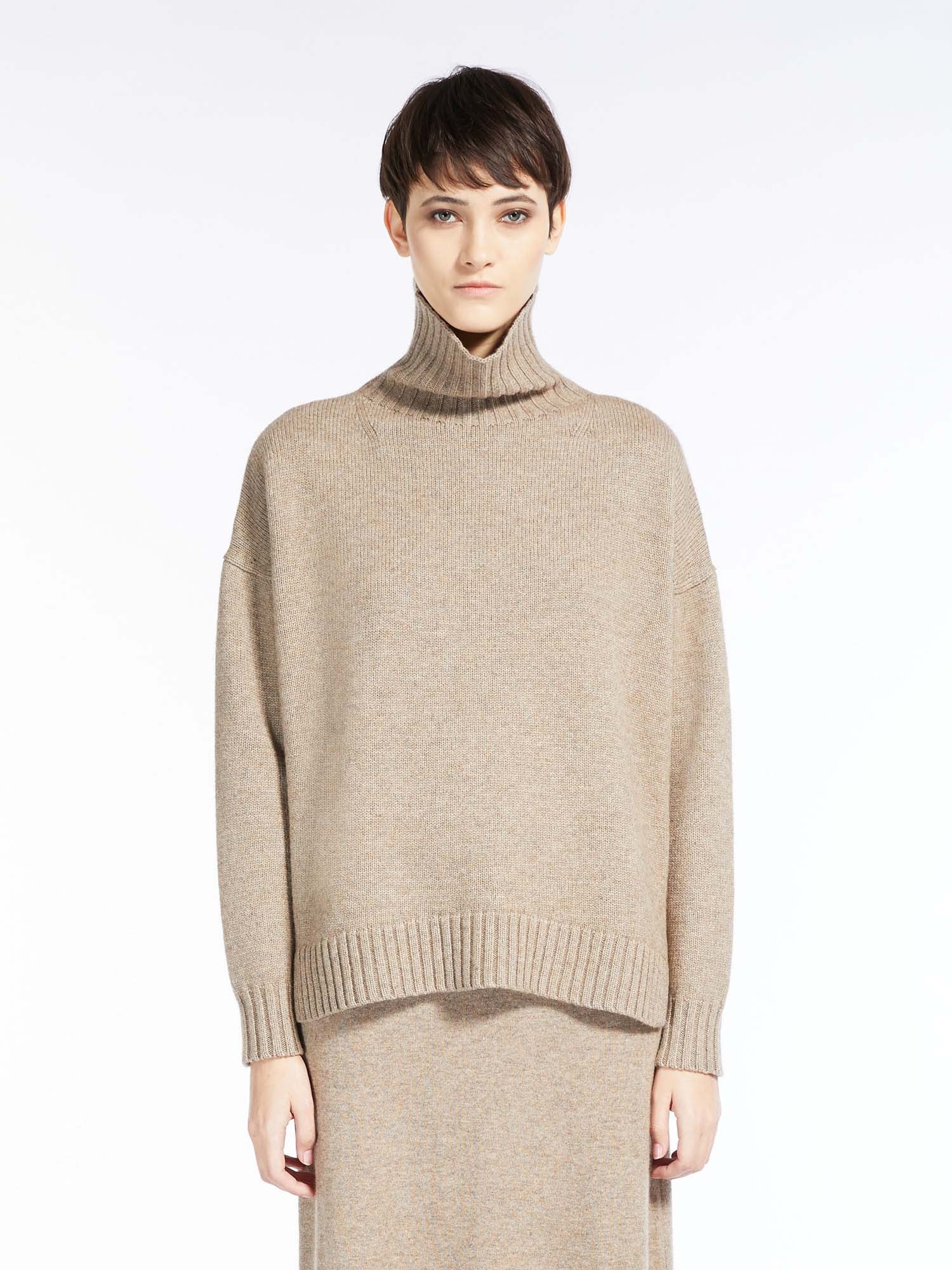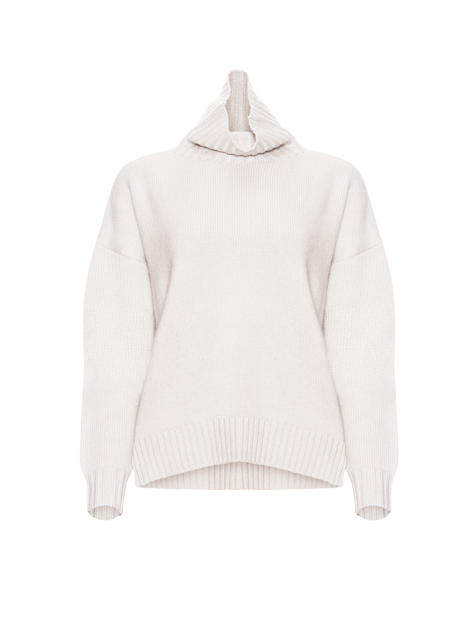 High neck pullover made of fine wool and cashmere yarn with a large and loose, wide volume and slightly square line. The style is finished with long, dropped-shoulder sleeves, side slits on the hem and ribbed edges. Length: 66 cm.