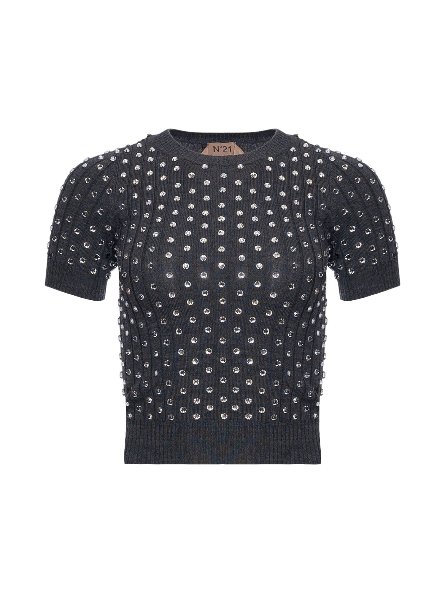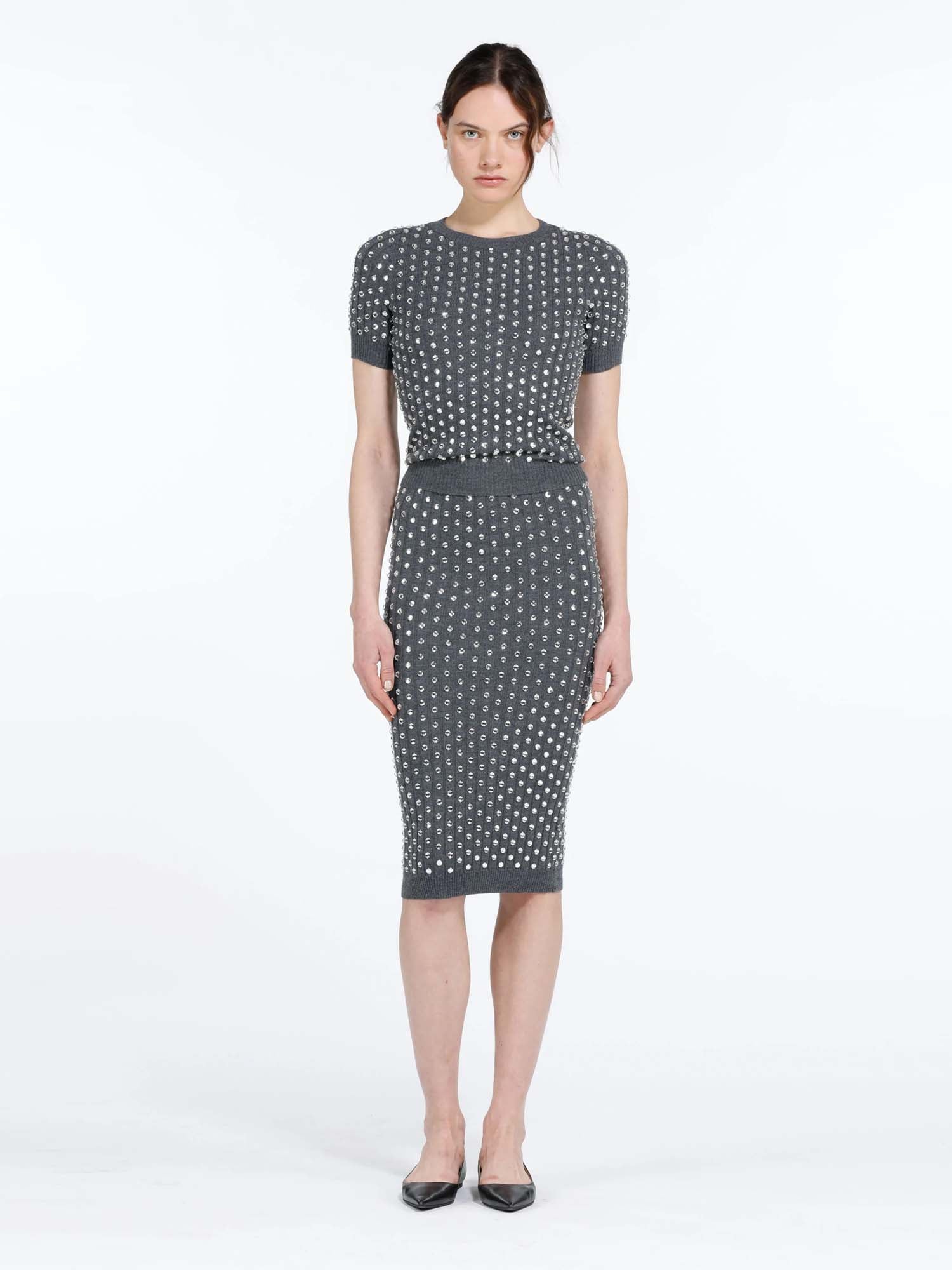 Steel-grey virgin wool sweater with all-over crystal embellishments. Crew neck. Short sleeves. Ribbed-knit trims.