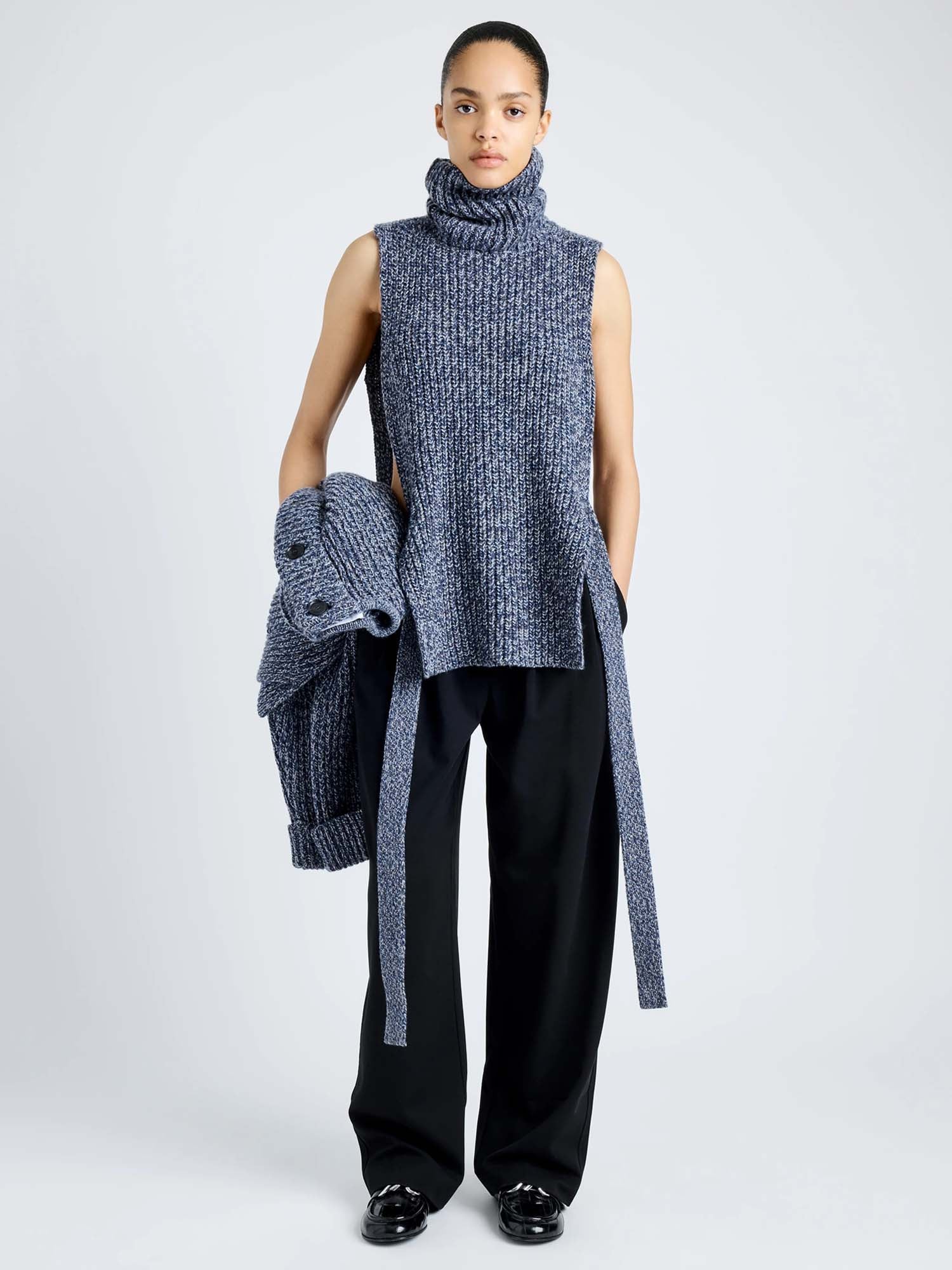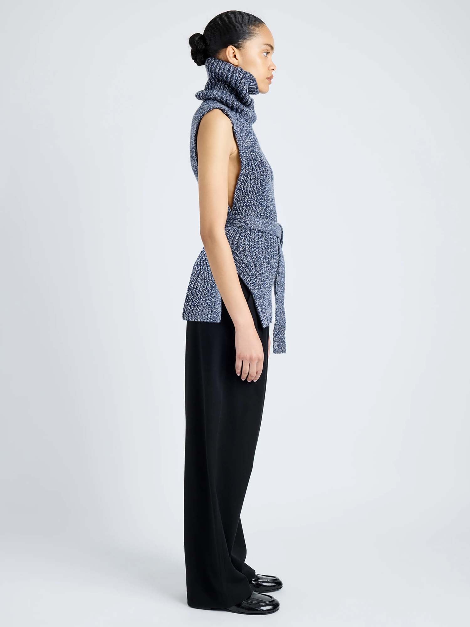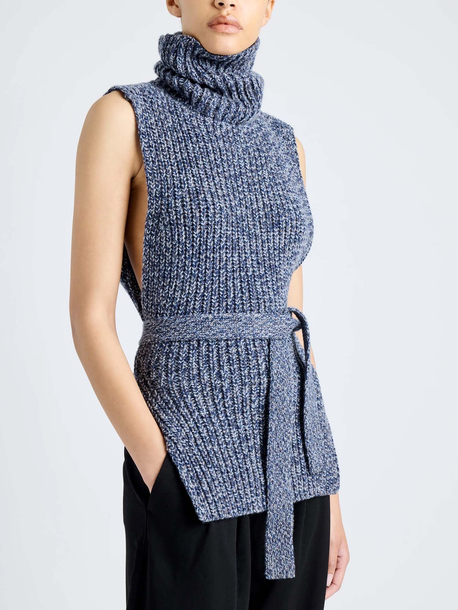 The Ember Vest in Mouline Knits is crafted to a sleeveless silhouette with a turtleneck and open sides. Detailed with self-ties that can be styled undone or wrapped around the waist for a cinched finish.