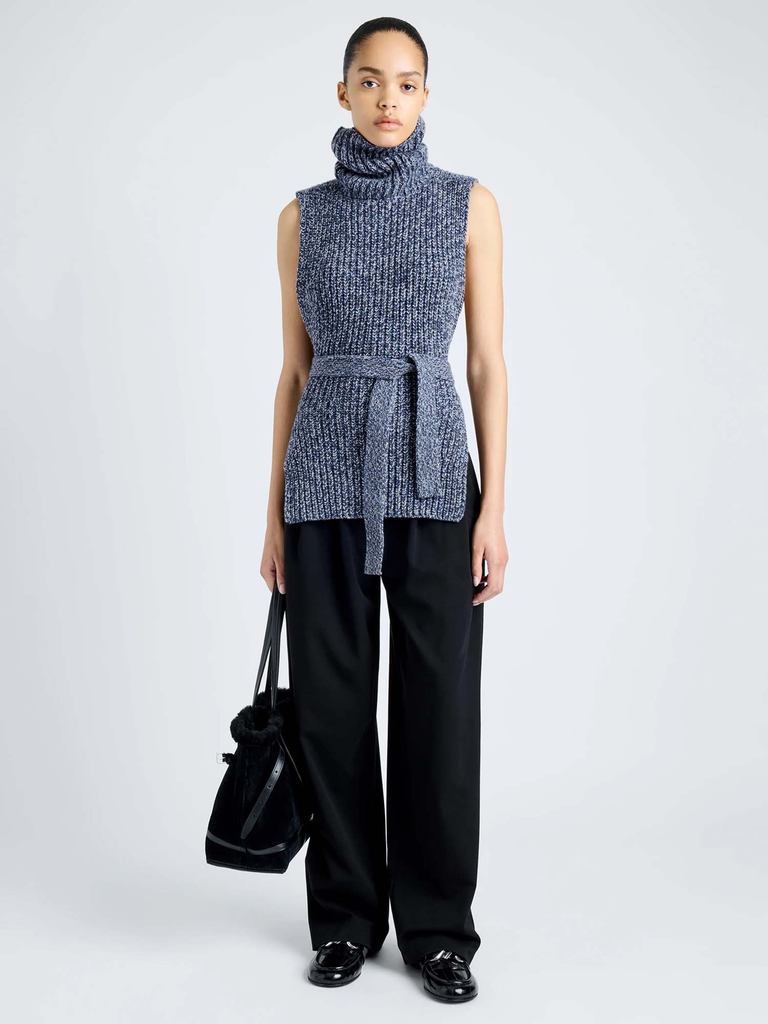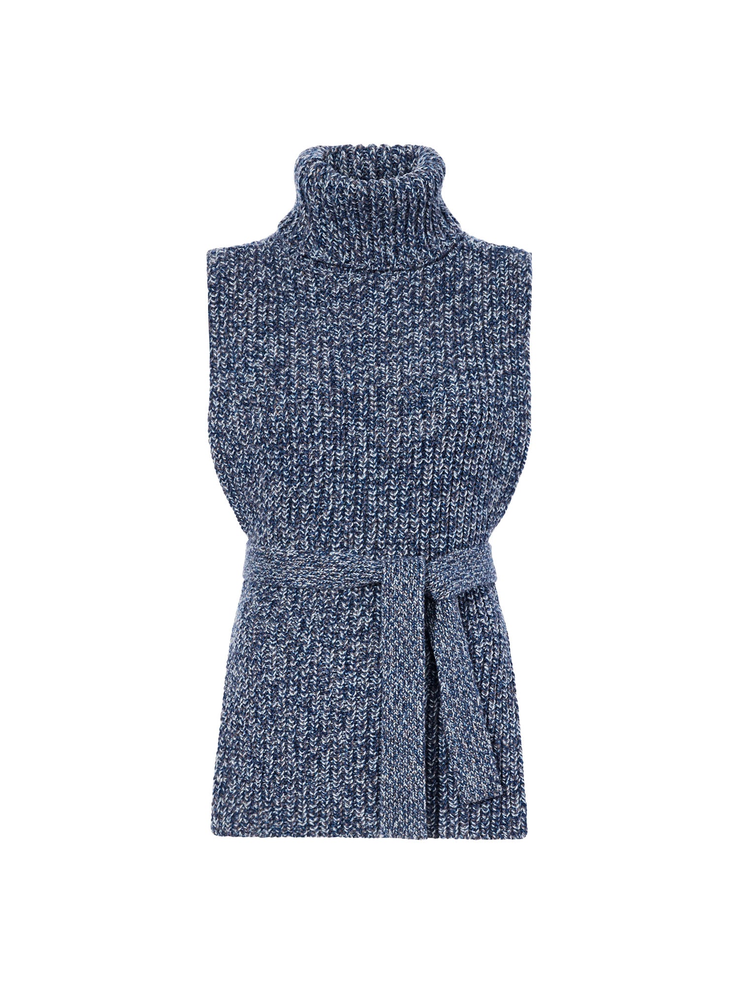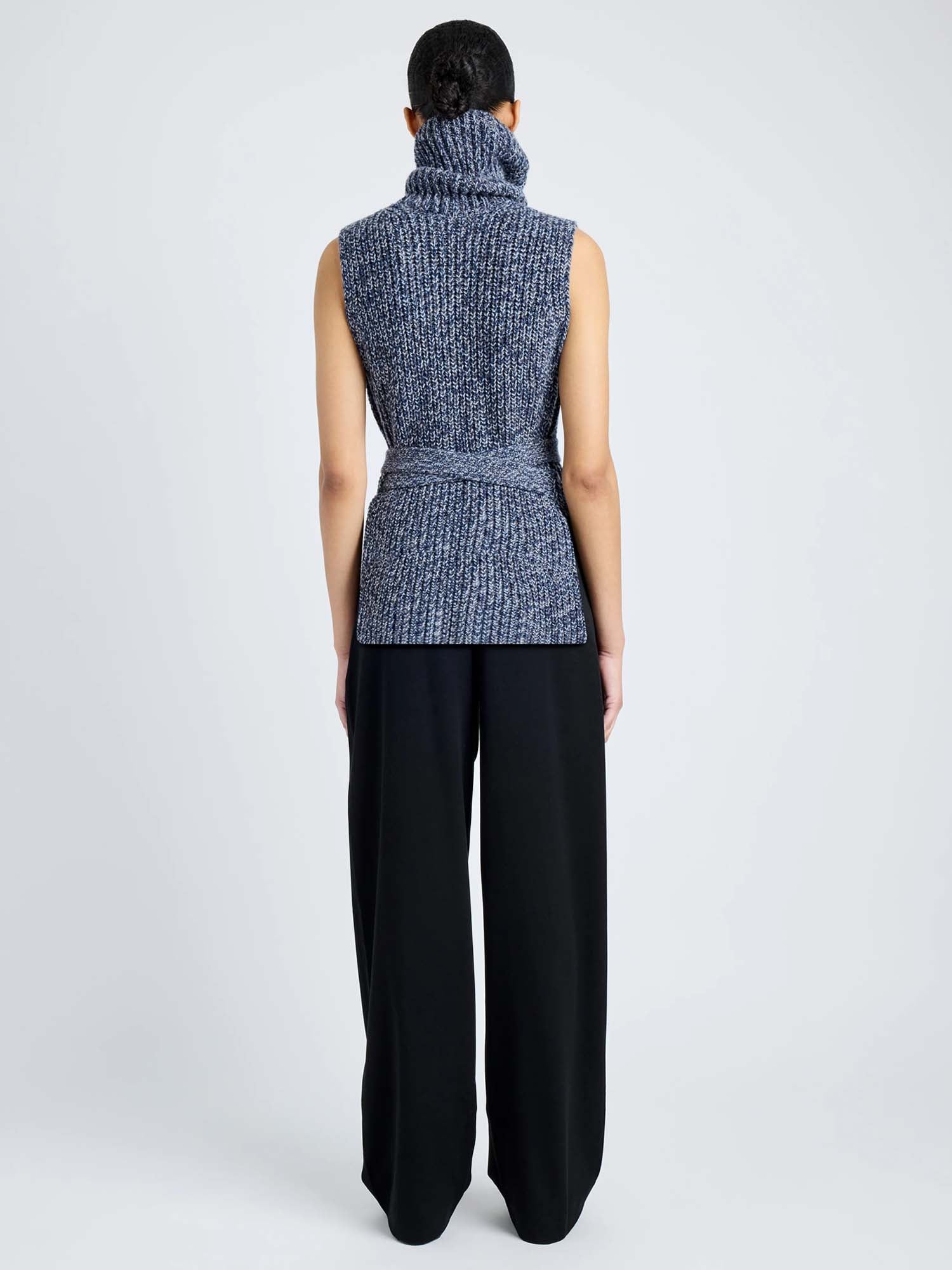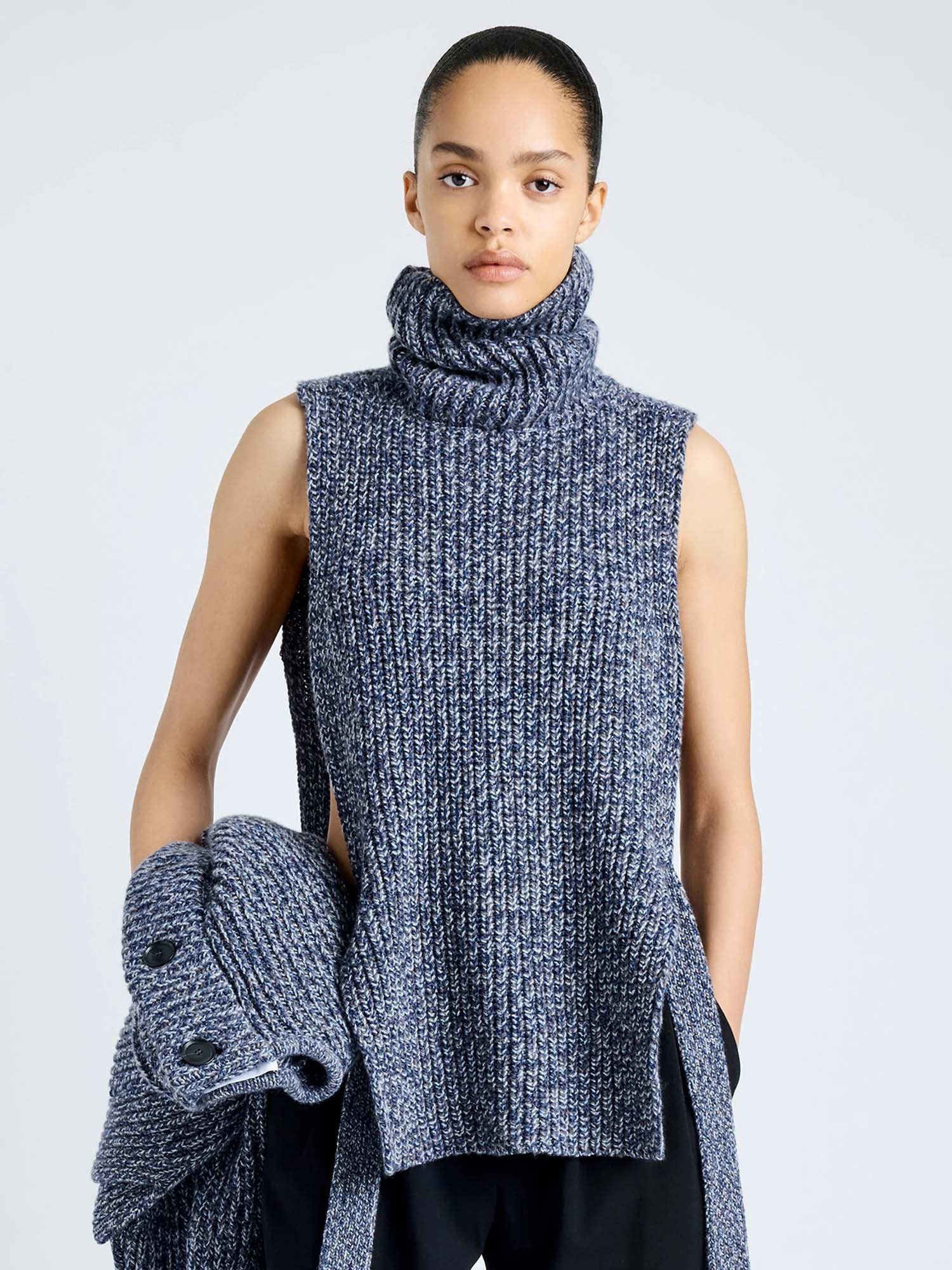 The Ember Vest in Mouline Knits is crafted to a sleeveless silhouette with a turtleneck and open sides. Detailed with self-ties that can be styled undone or wrapped around the waist for a cinched finish.