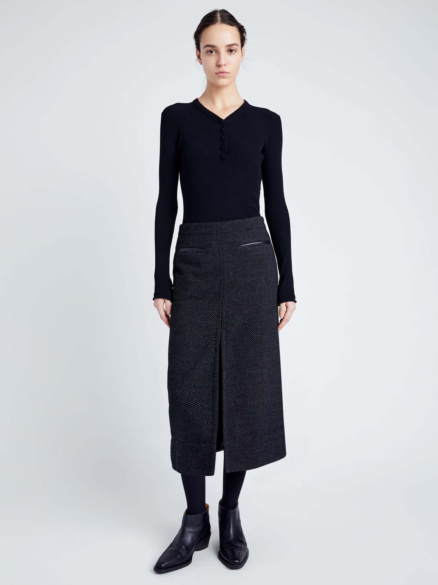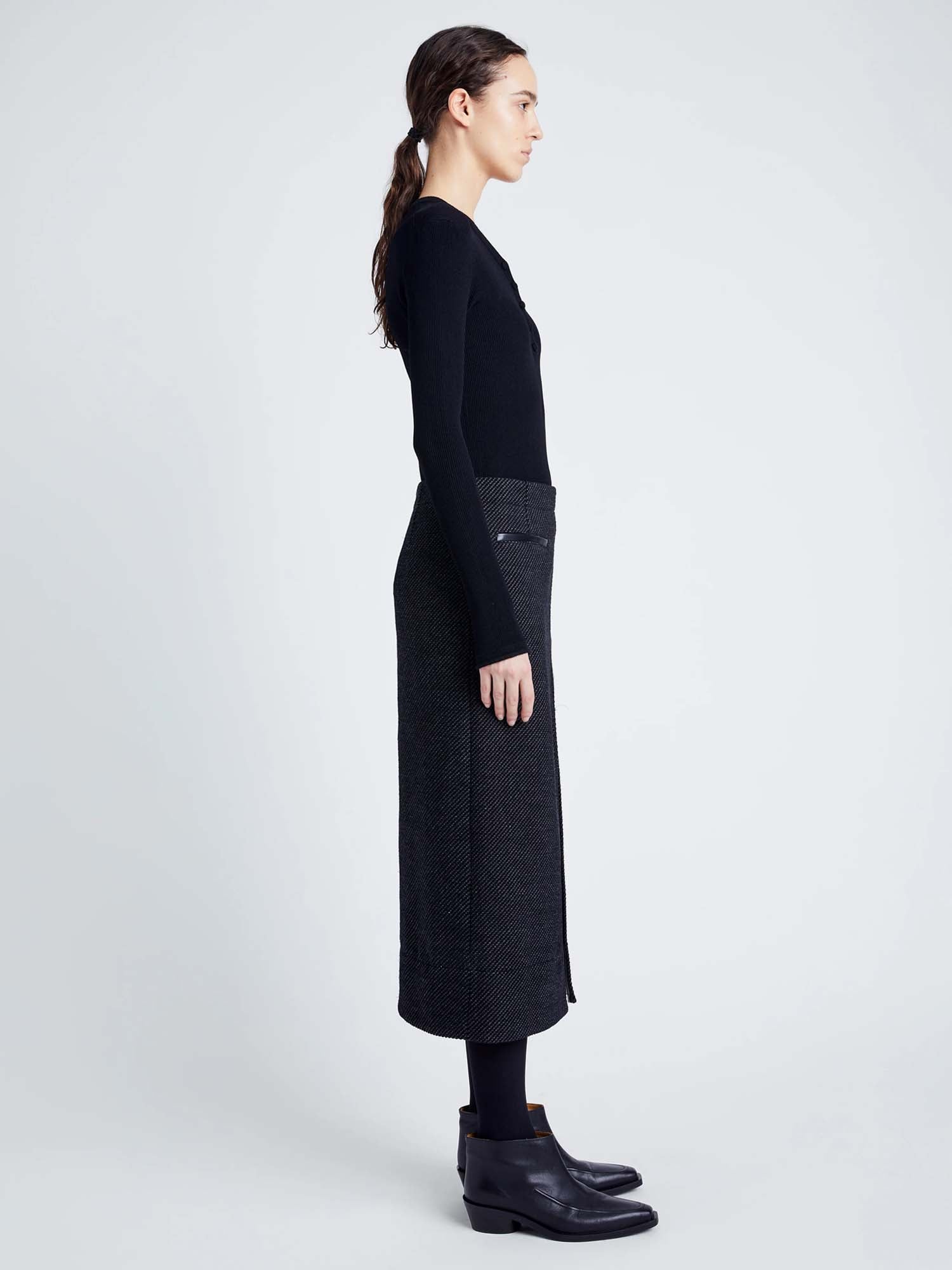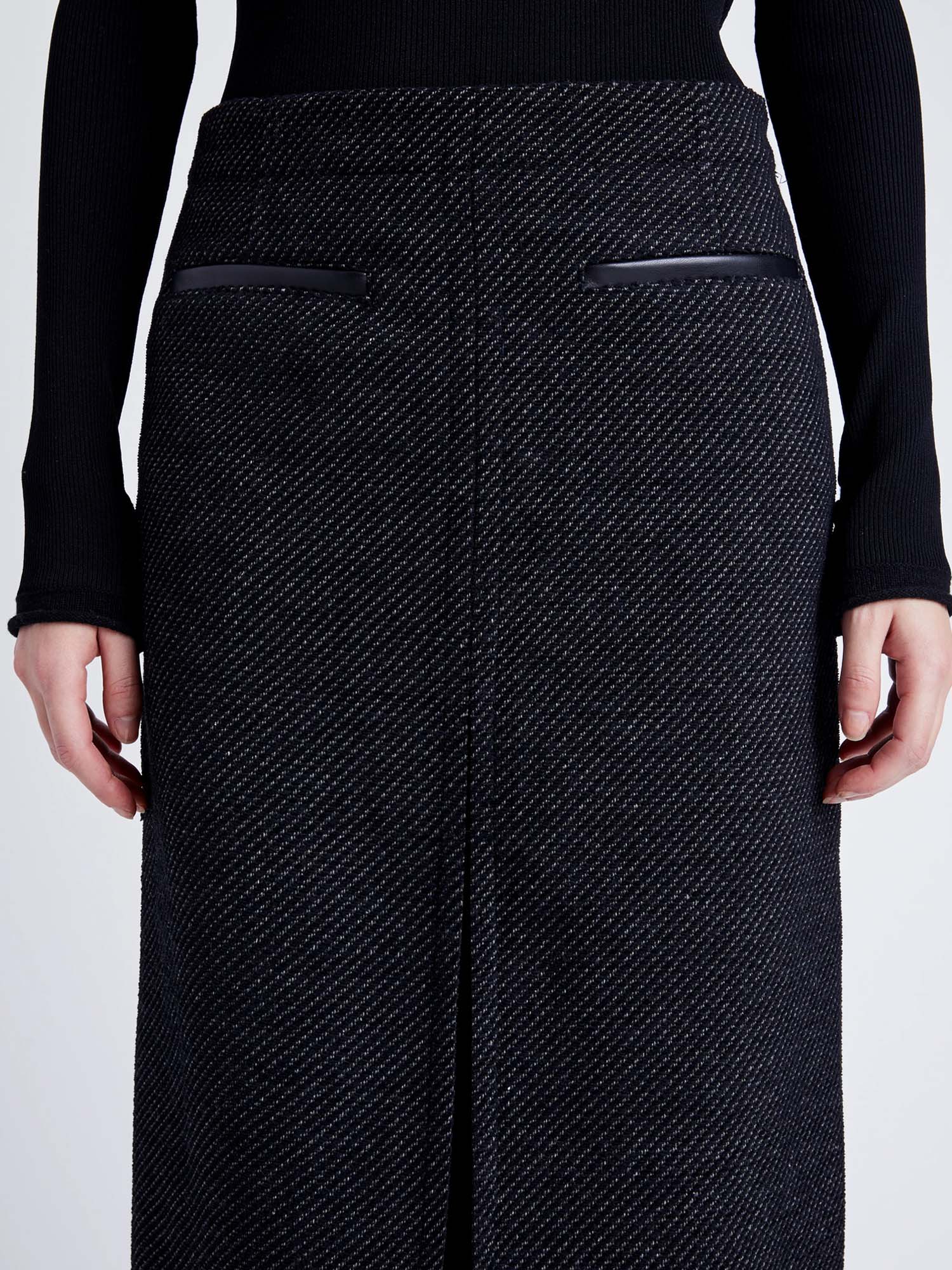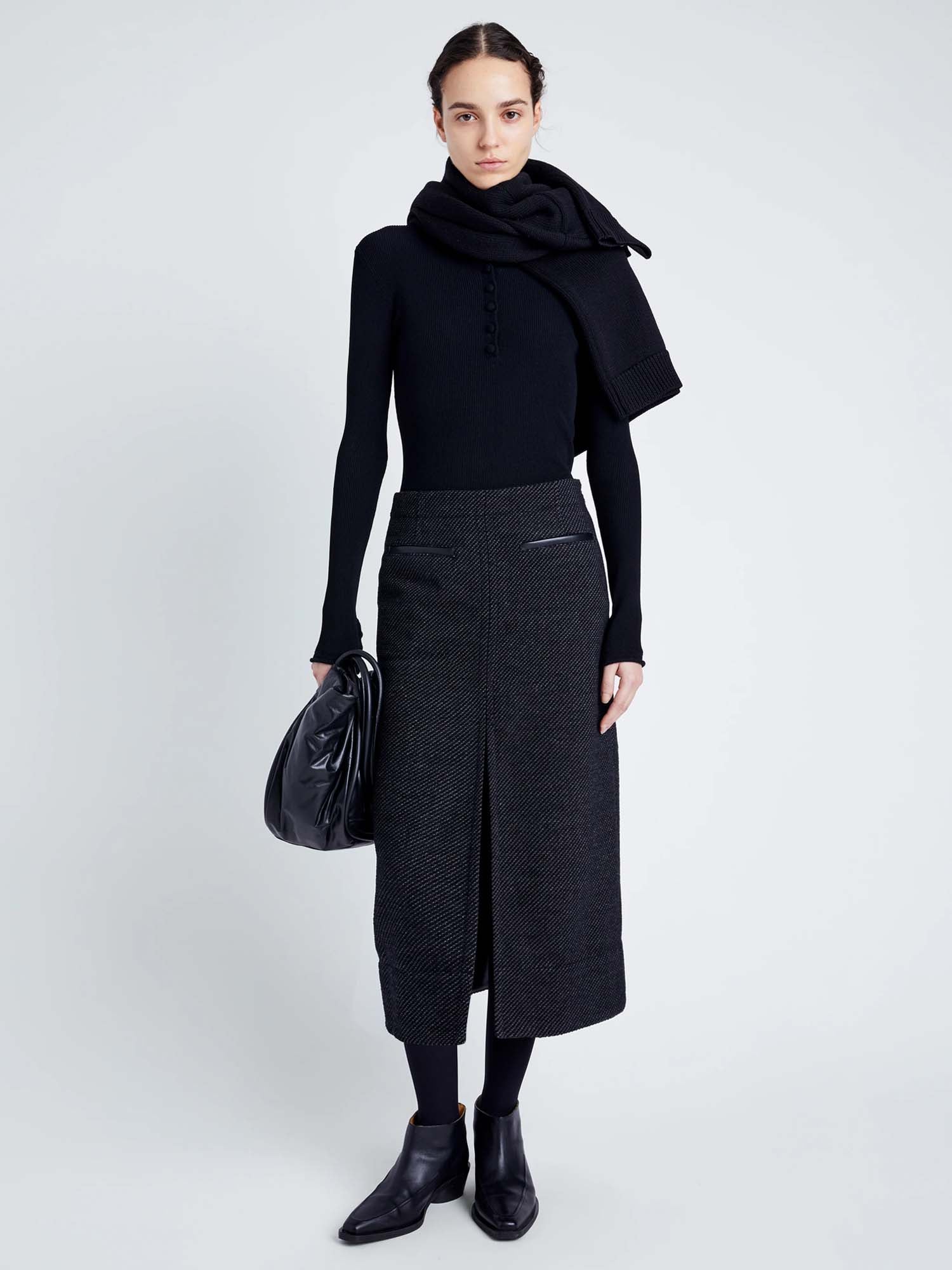 The Kingsley Skirt in Soft Twill Coating is cut to a mid-length silhouette with a front slit. Sitting high on the waist, it's finished with faux leather detailing.