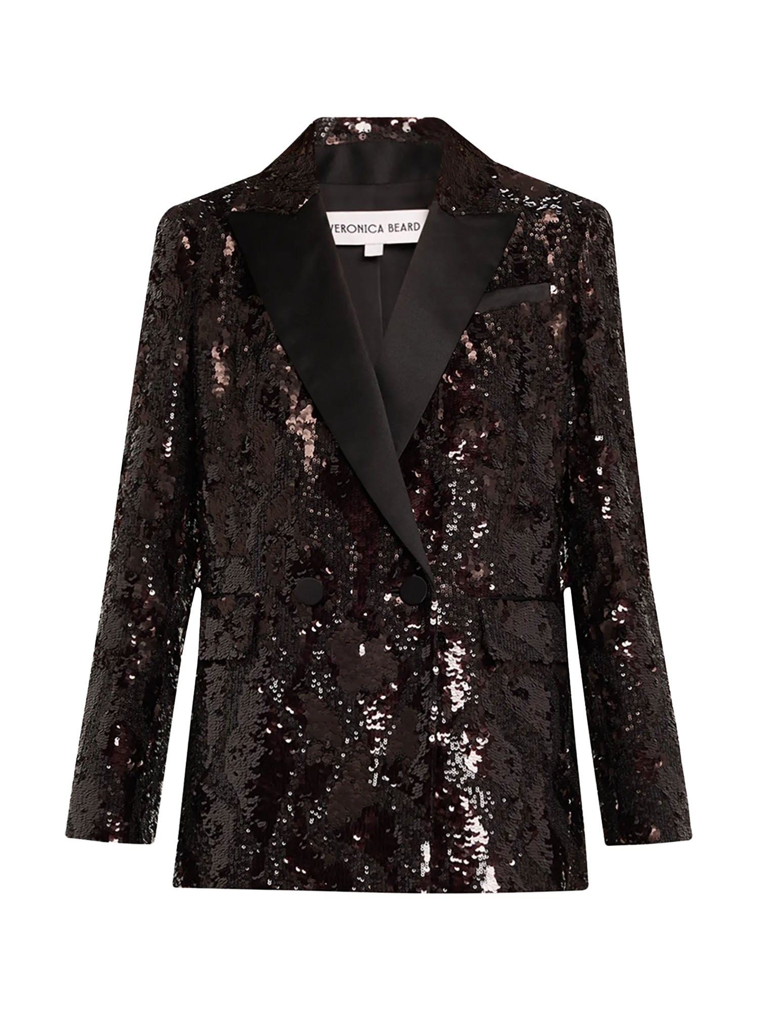 Veronica Beard's signature silhouette comes through with a tailored, double-breasted version made from sequins with peaked satin lapels for a tuxedo-inspired finish.